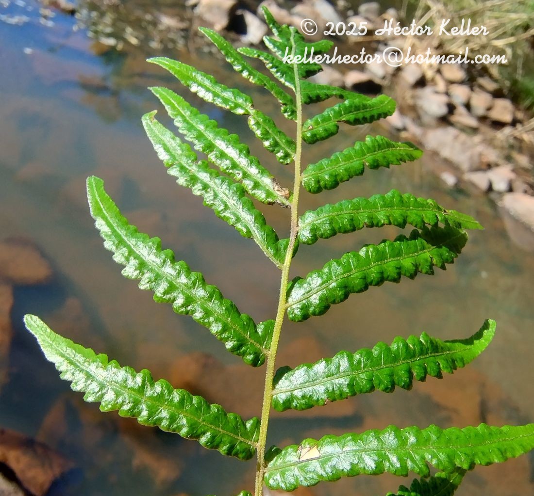 Rizomas rastreros, de 2-4 mm de diámetro., con escamas castañorojizas, triangular lanceoladas, pilosas, pelos ramificados. Frondes subpolísticas, de 30-60 cm de largo; pecíolos pajizos, 1/3-1/2 de la longitud total de la fronde, de 0,5-2 mm de diámetro, pubescentes a glabrescentes, pelos ramificados en toda su superficie; láminas pinnadas, de contorno ovado-triangular, ápice pinnatífido, de 7-17(-20) cm de ancho, papiráceas a cartáceas; raquis con pelos ramificados en la cara adaxial, de 0,1-0,25 mm de largo, glabros en la cara abaxial; pinnas triangular-lanceoladas, las medias e inferiores auriculadas en la base, margen crenado o aserrado, 9-18(-20) pares, distanciadas 1-2 cm, de 0,7-1,3 cm de ancho, con 3-5 pares de venas, las basales anastomosadas formando una vena excurrente al seno, costa adaxial y margen con pelos setiformes antrorsos, cara abaxial glabra. Soros circulares o subelípticos, medios o subcostales, sin indusio; esporangios glabros. Esporas amarillas, aladas.