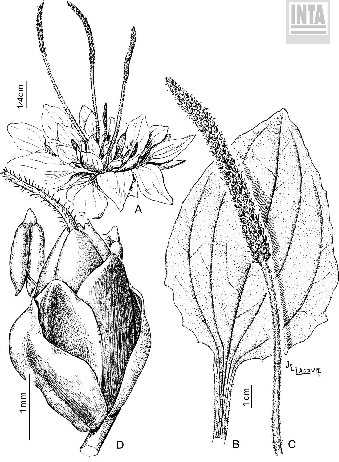 Hierbas perennes, rizomatosas, hasta de 0,4 m de alto. Hojas arrosetadas, con pecíolos de 3-12 cm de largo, canaliculados; láminas ovadas a ovado-elípticas, de 6-15 × 3-10 cm, glabras o parcialmente híspidas en ambas caras, con 3-9 venas principales, ápice obtuso, margen sinuado o dentado. Espigas cilíndricas, multifloras, de 6-18 cm de largo, con flores dispuestas en espiral; escapos ascendentes o bien erectos, de 6-30 cm de alto. Flores en la axila de una bráctea de 1,2-2 mm de largo, ovado-triangular, cóncava, glabra, con carena angosta; cáliz con sépalos connados sólo en la base, membranáceos, elípticos, glabros, de 1,7-2 mm de largo; corola con el tubo glabro, lóbulos ovados, obtusos, de 1 mm de largo; estambres 4, insertos en el tercio inferior del tubo corolino. Pixidio cónico, de 2-4 mm de largo, con 6-31 semillas. Semillas ovoides a ovoideo-elipsoides, pardo-oliváceas, de 1-1,5 mm de largo.