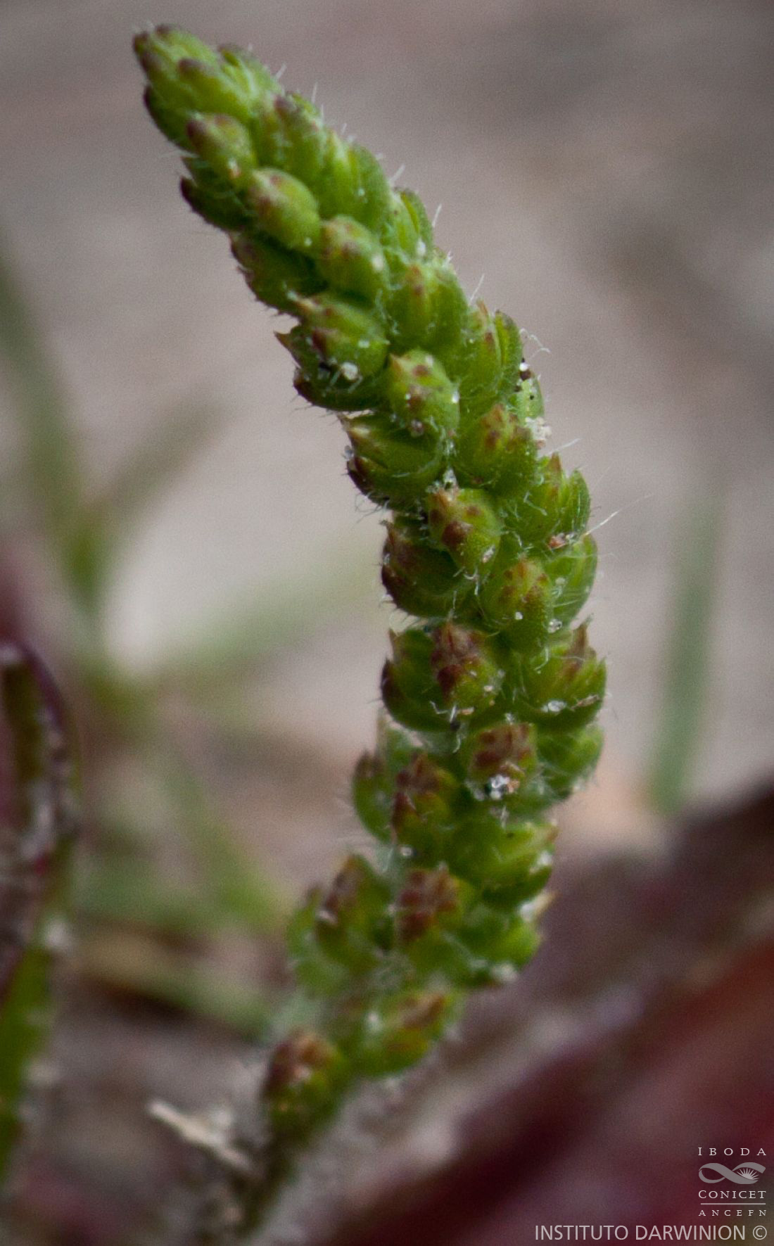 Hierbas anuales, hasta de 0,45 m de alto; raíz primaria fusiforme, engrosada; cáudex inconspicuo. Hojas arrosetadas, alternas, pseudopecioladas; láminas elípticas a lanceoladas, de 3-25 × 0,3-7 cm, hirsutas o bien glabrescentes en ambas caras, ápice agudo, base atenuada, margen entero o ligeramente dentado. Espigas cilíndricas, multifloras, densas, de 1-20 cm de largo; escapos erectos o ascendentes, de 1-28 cm de largo, densamente pubescentes con tricomas largos, patentes, articulados. Flores en la axila de una bráctea triangular, de 1,2-3 mm de largo, ciliada en el margen y pubescente en la cara adaxial; cáliz con sépalos connados sólo en la base, los anteriores elípticos, de 1,5-2,7 mm de largo; corola con el tubo glabro, lóbulos generalemte erectos, los anteriores de 1,6-3,6 mm de largo, superando la longitud de los posteriores; estambres 4, exertos; ovario con 3 óvulos. Pixidios elipsoides, 3-seminados, de 2,5-3,2 mm de largo. Semillas elipsoides, de 1,5-2 mm de largo, testa punteada, olivácea.