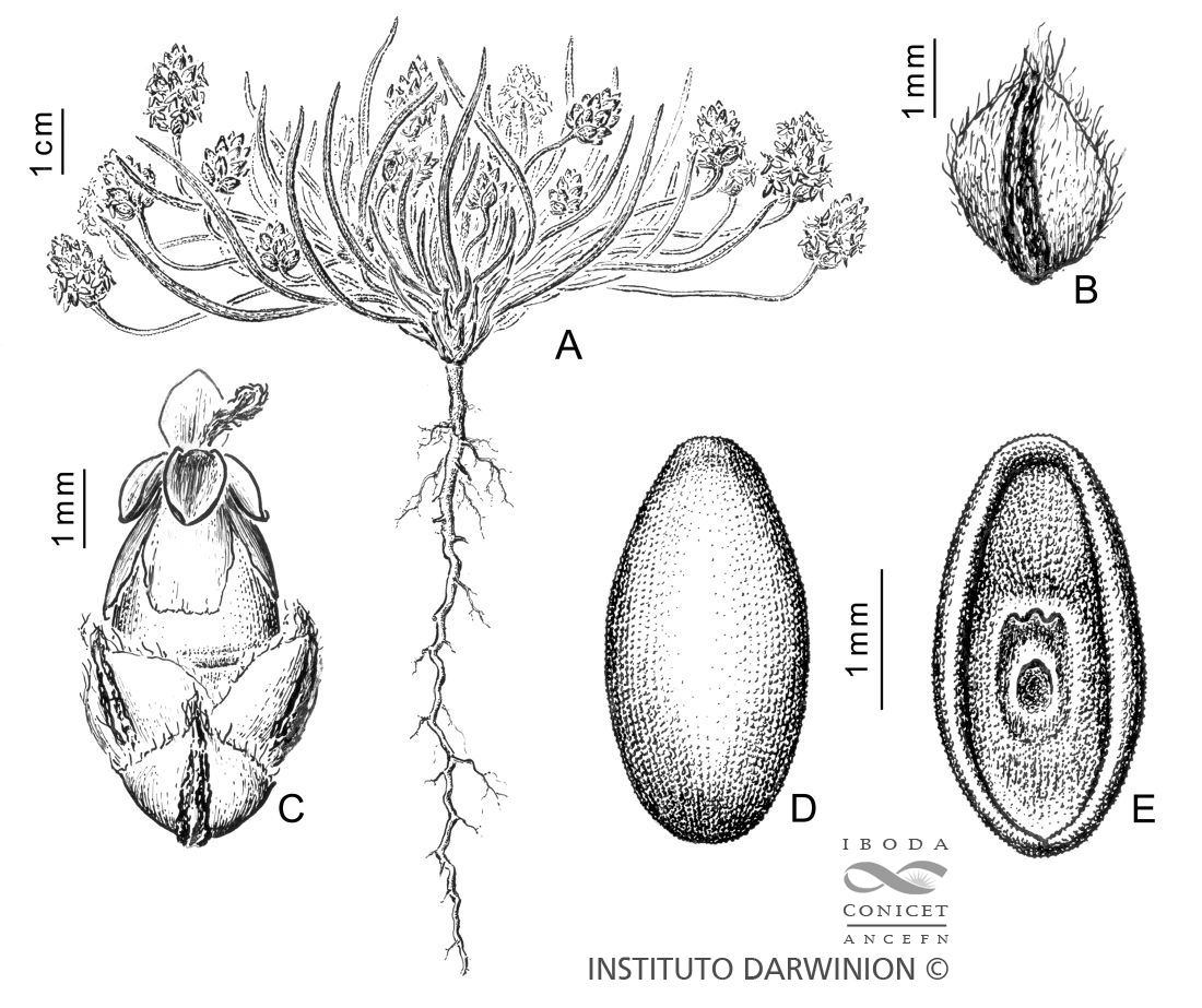 Hierbas anuales, bienales o hasta de 3 años, hasta de 0,15 m de alto; raíz primaria profunda, fusiforme, engrosada, hasta de 15 cm de largo con raíces secundarias filiformes; cáudex corto, grueso, de 5-15 mm de largo. Hojas arrosetadas, alternas; láminas lineares, de 1,5-10 × 0,05-0,1 cm, ápice agudo, base subvaginante, margen entero, densamente seríceo-pubescentes, raramente glabras. Espigas ovoides o globosas, multifloras o bien paucifloras, de 5-15 mm de largo; escapos ascendentes, de 1,4- 14,5 cm de largo, densamente seríceo-pubescentes. Flores en la axila de una bráctea triangular-ovada, de 2-3 mm de largo; cáliz con sépalos connados sólo en la base, lóbulos de 2,6-3,2 mm de largo; corola con el tubo glabro, lóbulos de 1,3-3,3 mm de largo. Pixidio 1-seminado, elipsoide, de 4,5-5,2 mm de largo. Semillas elipsoides, de 1,9-2,7 mm de largo.