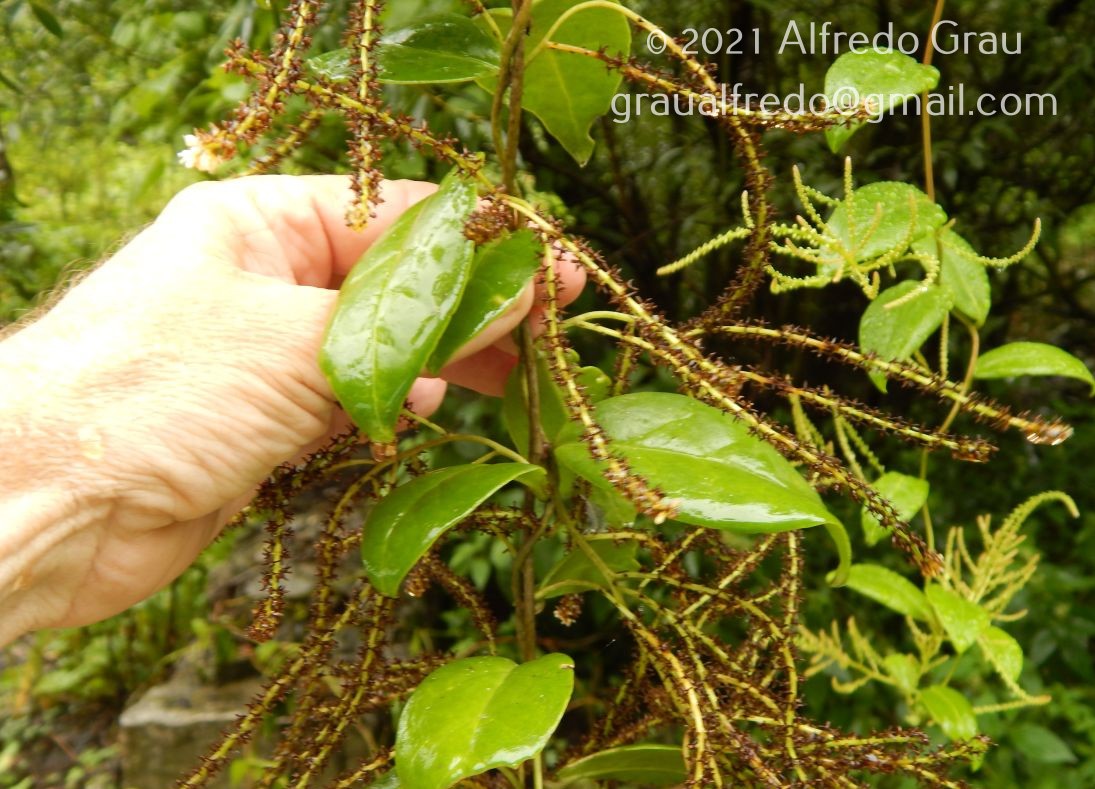 Enredadera perenne, sin tubérculos aéreos. Hojas de 3,5-12 × 2-4,5 cm, ovadas, lanceoladas o elípticas, de base redondeada a cuneada y ápice obtuso, agudo a acuminado, pecíolo de 1-11 mm de largo. Inflorescencia en panículas axilares y terminales, de 4,5-20 cm de largo; bractéolas de 0,8-2 mm de largo, lanceoladas. Flores subsésiles con pedicelos de 0,2-0,5 mm de largo, con la bráctea basal muy ancha en la base y largamente subulada en el ápice, bractéolas apicales de 0,7-1,3 × 0,9-1,8 mm, subcordadas en la base y romas en el ápice; sépalos de 2,5-3,5 × 1,3-2 mm, soldados en la base, oblongos, similares a los 2 pétalos externos, con la apariencia de un cáliz 4-mero y cruciforme, blanquecinos en la antesis y castaños en el fruto; pétalos internos 3, de 2,3-3,6 × 1-2 mm, elípticos, ligeramente más cortos que los exteriores, blanquecinos en la antesis y castaños en el fruto; filamentos estaminales de 2,4-2,7 mm de largo, algo más largos que la corola, anteras de 0,9-1,5 mm de largo; ovario de 0,5-0,7 mm de diámetro, umbonado, globoso o piriforme, estilo 1, de 1,5-1,9 mm de largo, articulado y estigma capitado a 3-lobado y papiloso. Fruto globoso a piriforme, de 1 mm de diámetro, coronado por el perianto persistente.