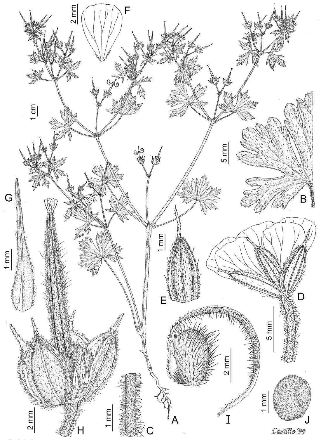 A. Planta. B. Porción de hoja. C. Porción del pedúnculo. D. Flor. E. Sépalo. F. Pétalo. G. Filamento estaminal. H. Fruto. I. Mericarpo. J. Semilla.