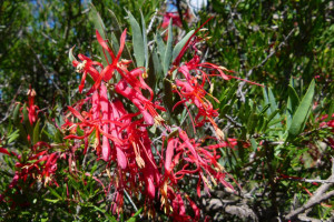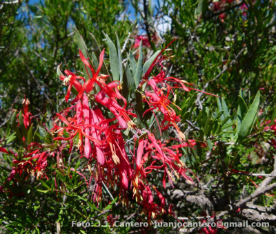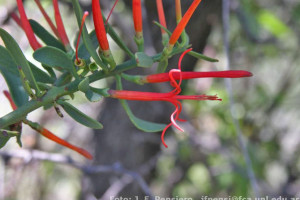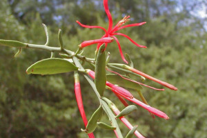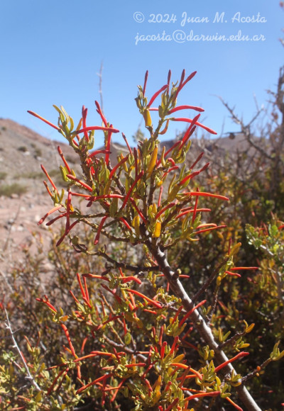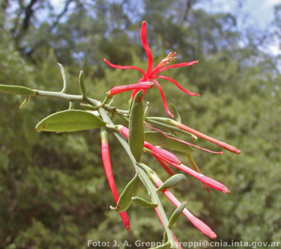 Arbusto con ramas rugoso-estriadas, las jóvenes subcomprimidas, las adultas cilíndricas, glabras. Hojas con láminas oblongas. Inflorescencias con 2-3 racimos 1-floros por axila; pedúnculo floral cilíndrico, de 5-15 mm de largo. Flores rojas, anaranjadas o amarillas; pedicelo ensanchado distalmente y a veces fusionado con la bráctea formando una cúpula subfloral 3(-4) dentada; botón floral cilíndrico en la base y oblongo-claviforme en el ápice; pétalos linear-espatulados, de 3,5-5 × 0,1-0,15 cm, carnosos; estambres de 3-4,5 cm de largo, anteras 2-tecas, de 5 mm de largo, subapiculadas. Fruto de 10 mm de largo × 6 mm de diámetro.