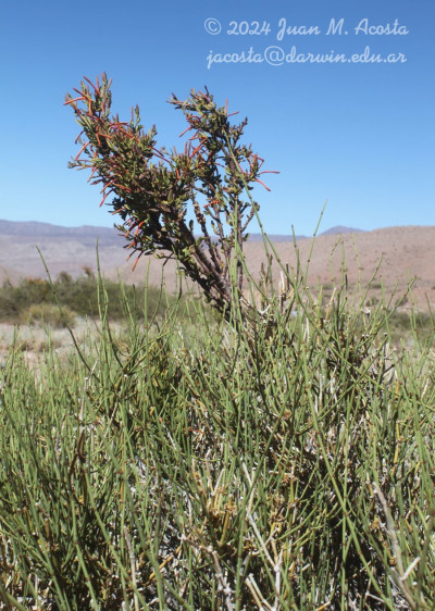 Esta especie crece entre los 5-3500 m s.m. en Perú, Bolivia, Chile, Brasil, Uruguay y la Argentina. En la Argentina se encuentra presente en la zona andina desde Jujuy hasta Mendoza, asociada a las sierras en San Luis y Córdoba y también en Santa Fe, Entre Ríos, La Pampa y Buenos Aires, entre los 50-2800 m s. m. En estas dos últimas provincias se la ha coleccionado, pero su presencia allí es poco frecuente. Vive sobre varias especies de plantas, en especial Ancardiaceae (Schinus sp.), Fabaceae (Neltuma sp., Geoffroea sp., Vachellia sp.) y Zygophyllaceae (Larrea sp.); su floración máxima es en otoño. La polinización es por picaflores y la dispersión de las semillas por aves.