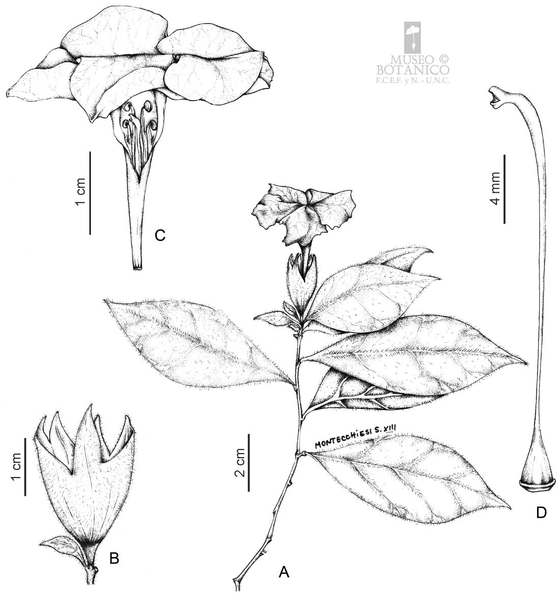 Arbustos hasta de 2 m de alto, ramificados desde la base, ramas con corteza rugosa que se desprende en capas longitudinales, las ramas terminales cubiertas de tricomas eglandulares largos (5-7 celulares). Pecíolos ca. 2,5 mm, con tricomas 5-6-celulares; láminas elípticas u obovadas, de (3-)6,5 (-9) × 1,5-3 cm, ápice acuminado, el nervio medio prominente en el envés, con algunos tricomas 5-7-celulares, envés piloso en hojas muy jóvenes. Flores solitarias, vistosas, a veces en inflorescencias terminales de 2 ó 3 flores, inodoras, con pedicelo piloso ca. 3 mm; cáliz campanulado-ventricoso, ca. 12 × 18 mm, más o menos cubiertos de tricomas delgados, agudos, eglandulares, 3-7-celulares, pocas veces trifurcados, en general con gruesa nerviación marcada al igual que el pedicelo; corola violeta, blanca a la madurez, glabra; tubo ca. 27 mm, 1 a 2 veces el largo del cáliz, limbo ca. 35 mm de diámetro; estambres con filamentos de 3 mm en el par interno y 4 mm en el par externo, cada par adherido al tubo corolino en su parte superior, anteras ca. 1,5 × 1 mm; ovario ca. 2 × 2 mm, algo cónico, estigma ca. 1,2 mm. Cápsula ca. 10 mm; semillas ca. 8 por fruto, elipsoides.