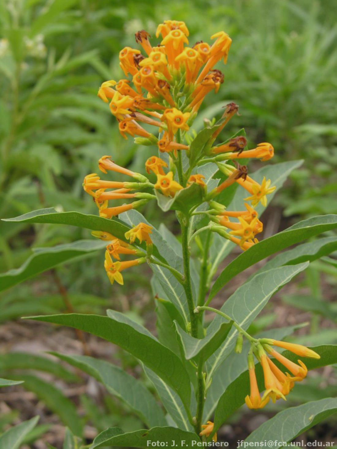 Árboles o arbustos de 1-5 m de alto; tallos hasta de 10 cm de diámetro, glabros, ramas jóvenes pubescentes hacia la porción distal. Hojas pecioladas de olor fétido, a menudo pubescentes; pecíolos ca. 10 mm; láminas ovadas, alargadas, de 1,2-6 × 4-15 cm, ápice acuminado a agudo, envés pubescente, velutino a tomentoso, con los nervios algo prominentes. Inflorescencias con 10-20 flores sésiles, pedúnculos pubescentes, hasta ca. 8 cm de largo. Cáliz ca. 6 mm, glabro, con lóbulos pubescentes, de color verde pálido; corola de 15-22 mm, anaranjada, tubo corolino glabro o apenas pubescente, al igual que los filamentos estaminales doblemente geniculados; estambres heterodínamos, adheridos al tubo apenas por debajo de su mitad, porción libre ca. 8 mm, anteras de 1-1,3 mm. Baya elipsoide ca. 13 × 7 mm, con 6-13 semillas; embrión algo curvo, ca. 3,5 mm.