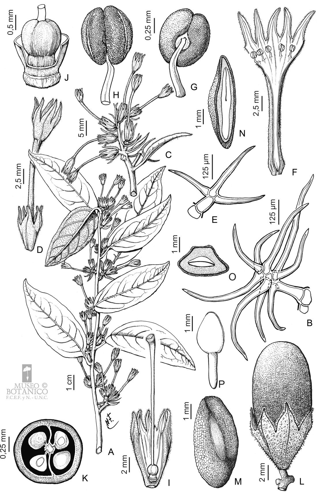 A. Rama florífera. B. Tricoma eglandular ramificado del hipofilo. C. Ápice de rama florífera. D. Flor. E. Tricoma eglandular ramificado del cáliz. F. Corola desplegada. G. Estambre, vista dorsal. H. Estambre, vista ventral. I. Gineceo y cáliz. J. Ovario. K. Ovario, corte transversal. L. Fruto. M. Semilla. N. Semilla, corte longitudinal. O. Semilla, corte transversal. P. Embrión.
