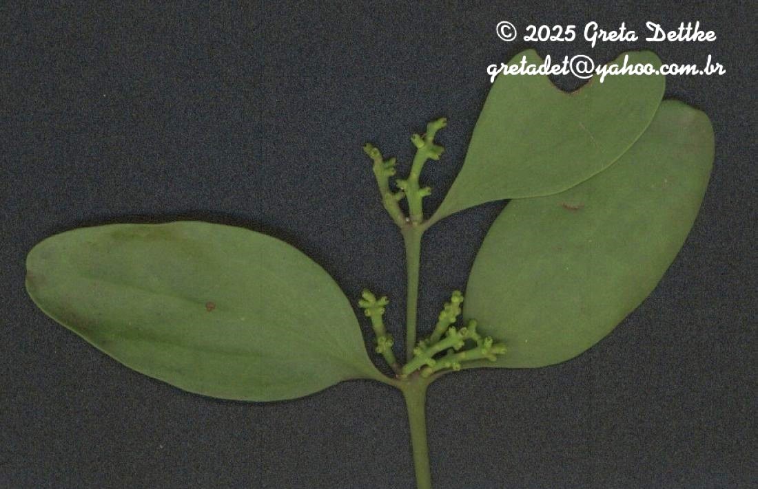 Hierbas diclino-monoicas, glabras; ramificación percurrente, eventualmente dicotómica debido al aborto del meristema apical; ramas erectas o colgantes, de color verde oscuro a verde claro, cuando secas verde o castañas; sistema endofítico con una o pocas ramas que emergen del sistema haustorial. Tallos circulares o elipsoidales en sección transversal, de 2-6 × 0,3-0,6 cm, los basales circulares después del engrosamiento secundario, alcanzando ca. 3 cm de diámetro; catáfilos de 3 mm de largo, presentes sólo en los entrenudos proximales de las ramas laterales,1 par ubicado ca. 4 mm desde la base. Hojas con pecíolo ca. 7 mm de largo; láminas obovadas, elípticas o ligeramente falcadas, de 3-8 × 1-3 cm, base aguda, decurrente, ápice obtuso, redondeado o ligeramente recto, carnosas. Inflorescencias en espigas laterales de 1-2 cm de largo, con 1 par de brácteas estériles en la base; segmentos fértiles 3, 2-seriados. Flores 3-7 por bráctea fértil y ubicadas en la porción distal del segmento; flores estaminadas 1-2, ca. 1 mm de diámetro, generalmente ubicadas en el segmento proximal; fovéolas poco profundas. Frutos elipsoides, blanco nacarados, ca. 8 × 4 mm, superficie lisa, pétalos abiertos y erectos. Semillas ca. 4 × 3 mm.