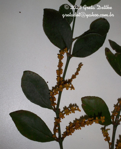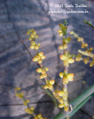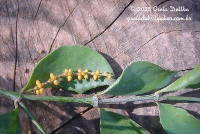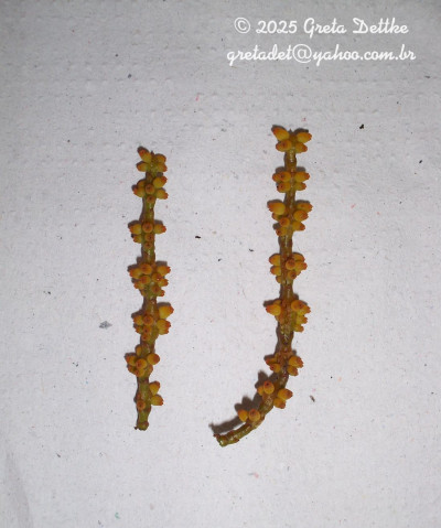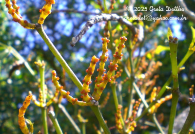 Hierbas diclino-monoicas, glabras; ramificación percurrente, ramas erectas o péndulas, verde oscuras a ligeramente amarillentas o rojizas, cuando secas castañas; sistema endofítico con una rama emergente del sistema haustorial. Tallos circulares en sección transversal, de 4-15 × ca. 0,7 cm, ligeramente aplanados en los nudos, las basales circulares ca. 6 cm de diámetro; catáfilos ca. 2 mm de largo en todos los entrenudos, 1 par en las ramas principales, ubicados a ca. 5 mm desde base y 1-3 pares en los entrenudos de las ramas laterales, el primero a ca. 5 mm desde la base y el resto entre 1-4 cm desde el primero. Hojas con pecíolo ca. 5 mm de largo; láminas elípticas u ovadas, de 4,5-12 × 2-6 cm, base aguda u obtusa, decurrente, ápice agudo, redondeado, margen liso, carnosas. Inflorescencias en espigas laterales, raro terminales, de 4-12 cm de largo, con 2-5 pares de brácteas estériles en la base; segmentos fértiles 4-8, 2-seriados, 3-9 flores por bráctea fértil, las estaminadas ocupan la 1° a 3° posición apical, el resto pistiladas. Flores ca. 1 mm de diámetro; foveolas poco profundas. Frutos globosos, rojizos, anaranjados o amarillentos, ca. 4 mm de diámetro, superficie lisa, pétalos abiertos, erectos. Semillas ca. 3 × 2 mm.