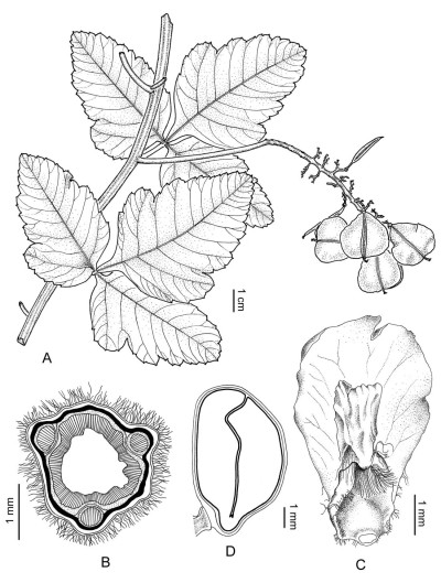Trepadoras glabras o pubescentes; tallos de sección triangular, con indumento denso de tricomas ferrugíneos o glabros; 3 cámbiumes supernumerarios. Hojas con estípulas triangulares, ca. 1,5 mm de largo, glabras o pubérulas, con pelos glandulares en el margen, persistentes; pecíolo de 1,5-4 cm de largo, marginado o canaliculado, tomentoso o pubérulo; lámina 1-yugada, 3-foliolada; peciólulo hasta de 1,4 cm de largo, alado en el folíolo terminal y a veces en los folíolos laterales o bien éstos subsésiles; folíolos ovados, de 4,5-8 × 2,8-5,5 cm, cartáceos, discoloros; base decurrente en el folíolo terminal, redondeada en los demás, ápice obtuso mucronado, ciliados, dentado-serrados, 11-30 dientes, los folíolos laterales asimétricos con una incisión de 1/4-1/3 de profundidad en semilámina externa; cara adaxial pubérula, cara abaxial pubescente o pubérula. Inflorescencia en tirsos; ejes pubescentes, indumento denso de tricomas breves y crespos; cincinos con pedúnculo de 3-6 mm de largo; pedicelo del fruto ca. 3 mm de largo, articulado en la mitad; brácteas ca. 2,5 mm de largo, velutinas, caducas. Flores de 5-7 mm largo; sépalos 5, los externos ca. 3,75 mm de largo, sublanuginosos, los internos ca. 4,25 mm de largo, velutinos en ambas caras; pétalos de 4-4,5 mm de largo, glandulosos en la cara interna, escama con cresta emarginada en los pétalos posteriores; lobos nectaríferos ovoides, los posteriores obtusos, los anteriores agudos; androginóforo glabro; estambres de la flor estaminada ca. 4,5 mm de largo, filamentos vellosos, en la flor pistilada ca. 3 mm largo; gineceo con ovario pubérulo, ramas del estigma de igual longitud que el estilo. Frutos coriáceos, mericarpos subsemicirculares con lóculo central lateralmente complanado rodeado de un ala, de 1,7-2 × 1,8-2 cm, cada lóculo ca. 5 mm de altura, con ala ca. 3 mm de ancho; epicarpo glabro o glabriúsculo, endocarpo lanoso. Semillas complanadas, elipsoides, de 6-7 × 3,25-4,5 mm; embrión con ambos cotiledones rectos, a veces el interno con una concavidad lateral leve cerca del ápice, donde encaja un pequeño lóbulo del cotiledón externo.