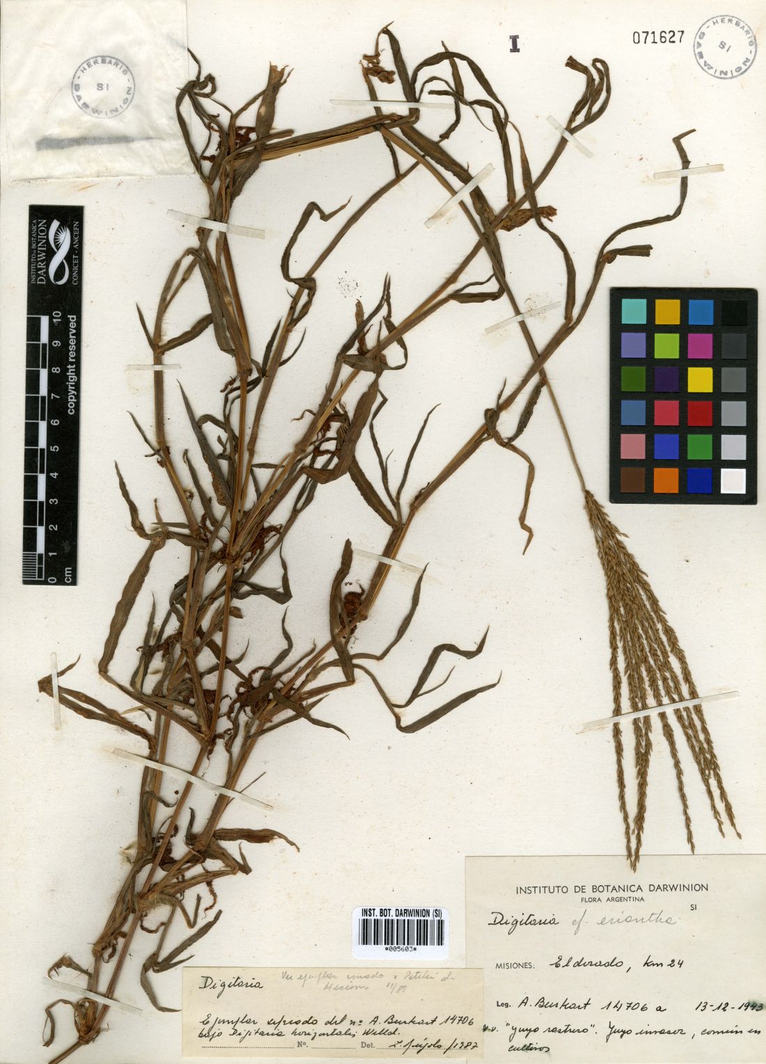 Plantas perennes de 60-120 cm de alto, estolonífera, estolones hasta de 6 m de largo; cañas ramificadas; nudos glabros; vainas glabras o densamente hirsutas en la base; lígulas de 3-5 mm de largo, membranáceas, triangulares, margen denticulado; láminas de hasta 30 cm x 6 mm, angostamente lanceoladas, de ápice acuminado, planas, glabras. Panícula digitada hasta de 18 cm de largo, con 3-14 racimos con espiguillas densamente dispuestas, racimos apicales alternos sobre un eje cuadrangular, escabroso, de 3 cm de largo; raquis triquetro, margen escabroso; pedicelos de 1-2,7 mm de largo, subtrígonos, escabrosos. Espiguillas de (2,5-)3-3,5 x 1 mm, en grupos de 2, indumento patente a la madurez; gluma inferior de 0,3-0,4 mm de largo, triangular, membranácea, enervia; gluma superior de 1,7-2 mm de largo, 3-nervia, pilosa en las zonas internerviales y marginales; lemma inferior tan larga como la espiguilla, 7-nervia, ápice agudo, nervios equidistantes, glabra a ambos lados del nervio medio y alternadamente pilosa y glabra en las zonas restantes; pálea inferior rudimentaria; antecio superior subigual a la lemma inferior, pajizo con tintes purpúreos; anteras de 1,5 mm de largo, purpúreas; estigmas purpúreos; cariopsis de 2,1-2,2 x 0,8-1 mm, elipsoide; hilo de 0,5 mm de largo, elipsoide; embrión menos de ½ de la longitud de la cariopsis.