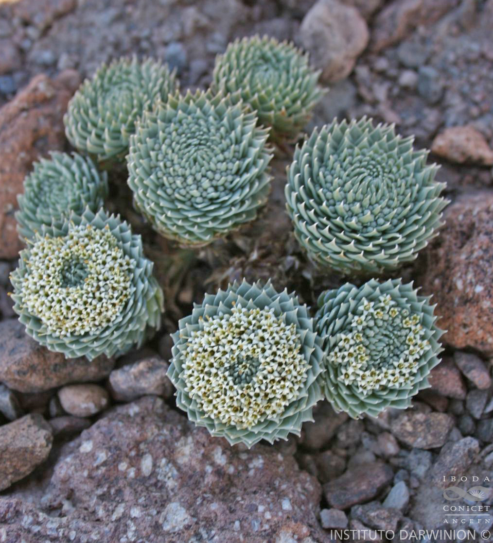 Hierbas caméfitas pulvinadas, glutinosas, de 2-5(-7) cm de alto. Hojas densamente rosulado-imbricadas; lámina lanceolada, entera, base atenuada en un pecíolo rectangular, ápice acuminado. Tirsoides condensados sésiles, rodeados por las hojas superiores. Brácteas lanceoladas, similares a las hojas y progresivamente estrechas hasta lineares. Involucro indiferenciado, grupos cimosos numerosos, 2-8-floros, sin profilos, flores solitarias pocas. Flor central terminal bien desarrollada. Sépalos lanceolados, de 1-1,2 mm de largo. Tubo estaminal-corolino de 1 mm de largo, tubo corolino de 2 mm de largo, lóbulos corolinos de 0,5-0,8 mm de largo. Tubo estaminal de 0,1-0,2 mm de largo, filamentos de 0,5 mm de largo, anteras oblongas, de 1,2-1,3 mm de largo, base agudo-sagitada. Ovario cónico-fusiforme, de 3-3,5 mm de largo. Cipselas cilíndricas, lisas, con 5 carenas reducidas, sépalos dentiformes.