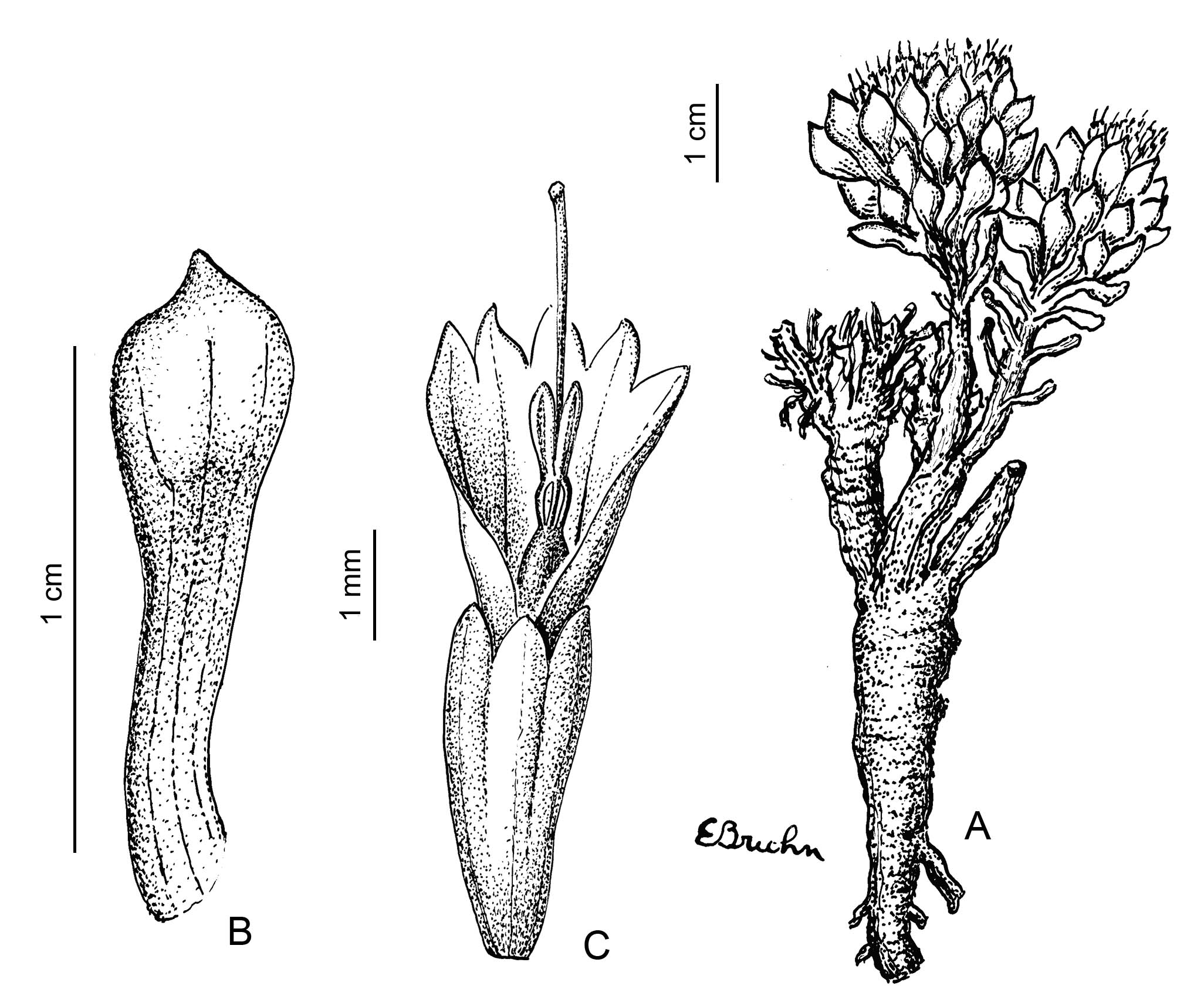 A. Planta. B. Hoja. C. Flor con corola parcialmente diseccionada para mostrar el androceo.