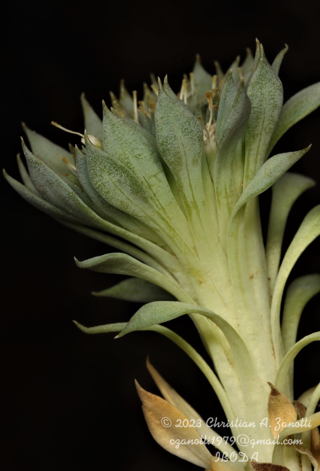 Hierbas caméfitas pulvinadas, glutinosas, de 2-5(-7) cm de alto. Hojas densamente rosulado-imbricadas; lámina lanceolada, entera, base atenuada en un pecíolo rectangular, ápice acuminado. Tirsoides condensados sésiles, rodeados por las hojas superiores. Brácteas lanceoladas, similares a las hojas y progresivamente estrechas hasta lineares. Involucro indiferenciado, grupos cimosos numerosos, 2-8-floros, sin profilos, flores solitarias pocas. Flor central terminal bien desarrollada. Sépalos lanceolados, de 1-1,2 mm de largo. Tubo estaminal-corolino de 1 mm de largo, tubo corolino de 2 mm de largo, lóbulos corolinos de 0,5-0,8 mm de largo. Tubo estaminal de 0,1-0,2 mm de largo, filamentos de 0,5 mm de largo, anteras oblongas, de 1,2-1,3 mm de largo, base agudo-sagitada. Ovario cónico-fusiforme, de 3-3,5 mm de largo. Cipselas cilíndricas, lisas, con 5 carenas reducidas, sépalos dentiformes.