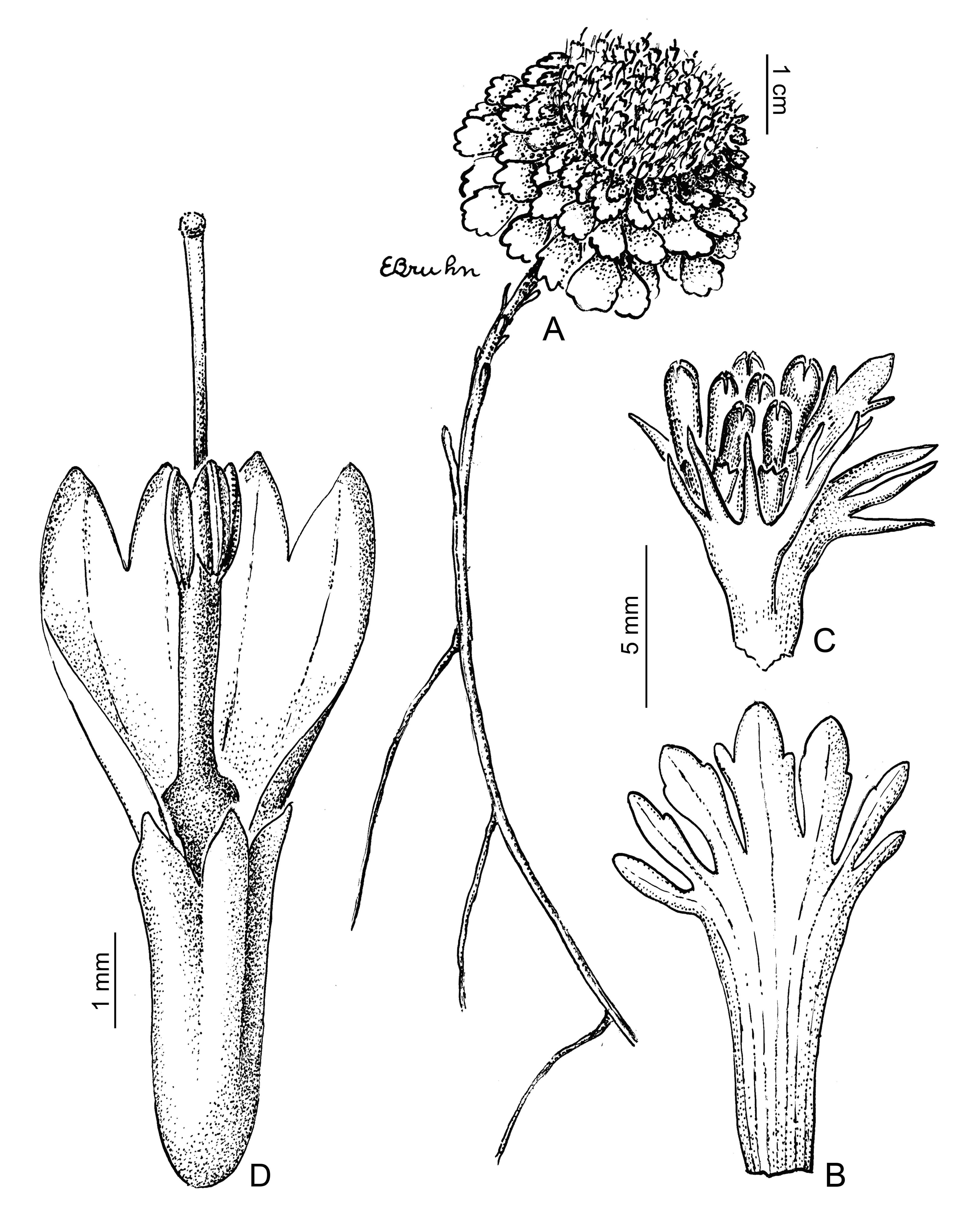 A. Planta. B. Hoja. C. Grupo cimoso con profilos lobulados. D. Flor con corola parcialmente diseccionada para mostrar el androceo