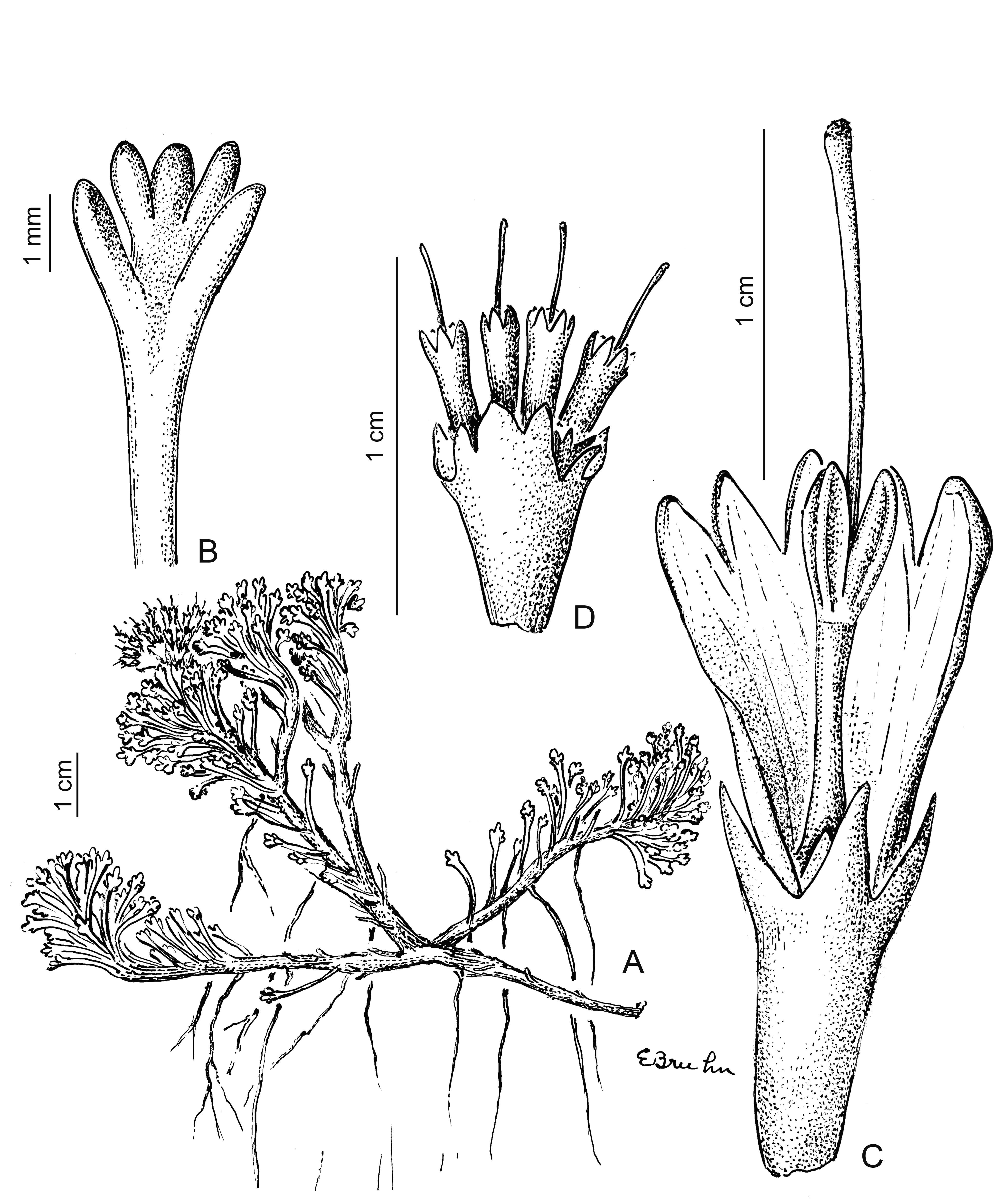 Hierbas caméfitas pulvinadas, glutinosas, hasta de 5 cm de alto. Hojas densamente rosuladas, glaucas, coriáceas, glutinosas; lámina conduplicda, palmada, 5-7-lobada, base atenuada en un largo pecíolo, ápice obtuso. Tirsoide condensado terminal sobre un pedúnculo corto y folioso (ca. 1 cm de largo) rodeado por las hojas superiores. Cada grupo cimoso acompañado por una bráctea tectriz foliosa, palmada, 5-lobada. Grupos cimosos periféricos sobre pedúnculos cortos, con profilos 3-lobados, fusionados en un involucelo. Grupos cimosos internos sésiles, con profilos oblongos, libres. Involucro diferenciado alrededor de las flores solitarias, brácteas del involucro libres, irregularmente 3-lobadas. Flores solitarias pocas, ebracteadas. Flor central terminal bien desarrollada. Sépalos lanceolados, de 1,5 mm de largo. Tubo estaminalcorolino de 0,7 mm de largo, tubo corolino de 2,5-2,8 mm de largo, lóbulos corolinos oblongos, de 1 mm de largo. Tubo estaminal de 2 mm de largo, filamentos nulos o muy reducidos, anteras oblongas, de 1-1,2 mm de largo, tecas de base agudosagitada. Cipselas prismáticas, lisas, con carenas, sépalos lanceolados, apiculo diminuto.