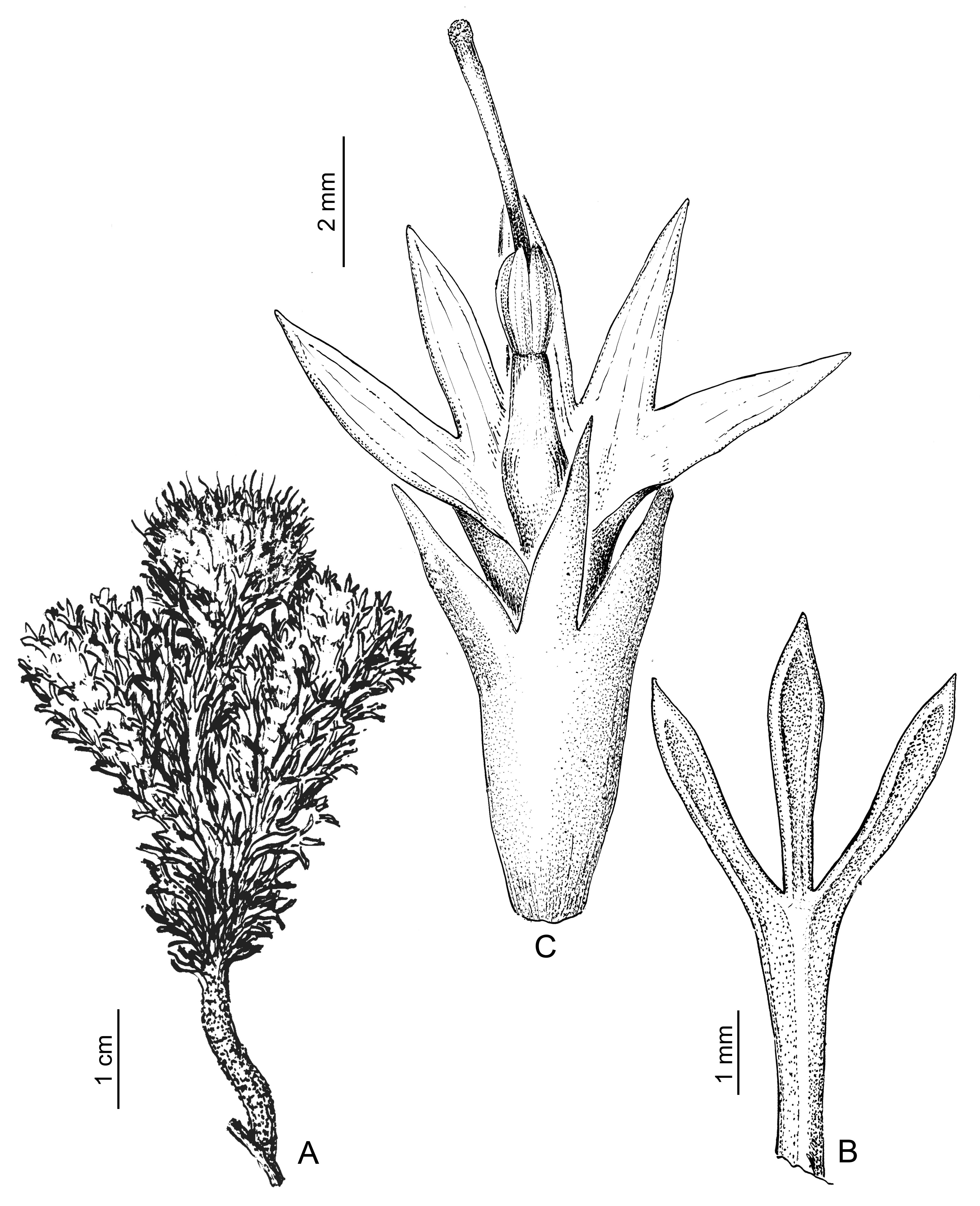 Hierbas caméfitas pulvinadas, glutinosas, hasta de 3 cm de alto. Hojas densamente rosulado-imbricadas, glaucas, coriáceas; lámina 3-lobada, base atenuada en un largo pecíolo, lóbulos lanceolados, acuminados. Tirsoide condensado terminal, sésil, rodeado por las hojas superiores. Grupos cimosos ausentes. Involucro indiferenciado. Flores solitarias numerosas, con brácteas foliosas, 3-lobadas (periféricas) a estrechamente lanceoladas (más internas). Flor central terminal bien desarrollada. Sépalos lanceolados a triangulares, de 1-2 mm de largo, membranáceos. Tubo estaminal-corolino de 1,5-2 mm de largo, tubo corolino de 0,51 mm de largo, lóbulos corolinos lanceolados, de 2,5 mm de largo. Tubo estaminal cónico, de 1,5-1,8 mm de largo, filamentos nulos o muy reducidos, anteras oblongas, de 1-1,2 mm de largo, tecas de base agudo-sagitada. Cipselas ovoides a prismáticas, rugosas, con carenas reducidas; sépalos lanceolados, membranáceos, apículo grueso.