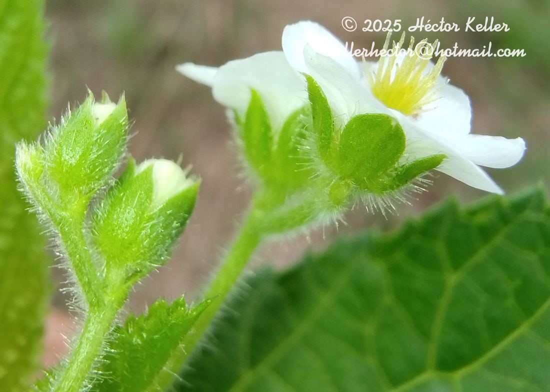 Sufrútice perenne, dioico, xilorrizo; tallos fistulosos, aculeados, con tricomas simples patentes y glandulares, menos abundantes hacia la base. Hojas ovadas, de 4,5-11 × 2,5-7,5 cm, subsésiles, de base suavemente cordada, ápice agudo u obtuso, borde aserrado, con tricomas simples y glandulares en ambas caras, con algunos acúleos en la cara abaxial, nervios curvos, palmados en la base; pecíolo de 1-3 mm de largo; estípulas triangulares aleznadas, con ambos tipos de tricomas. Inflorescencias diclinas, sobrepasando las hojas correspondientes, las de flores estaminadas plurifloras, erguidas, las de flores pistiladas 1-5-floras, de raquis florífero reflexo después de la antesis; brácteas con tricomas simples y glandulares. Flores estaminadas con pedicelo de 2-4 mm de largo; sépalos 5, de 4,7-5 × 1,2-1,5 mm, con tricomas simples y algunos glandulares, raro ausentes; pétalos 5, obovados, de 3,5-5,5 × 2-4,7 mm, iguales, glabros, de margen ondulado, notoriamente emarginados u obcordados; estambres 10, ápice de la columna 4-lobado. Flores pistiladas con pedicelo de 5-8 mm de largo; sépalos 5, de 6-9 × 2-3,5 mm, desiguales, con densa pubescencia simple y glandular en la cara externa y tricomas simples en la cara interna; pétalos obovados o elípticos, de 5-6 × 3-3,8 mm, obtusos o suavemente retusos, de borde ondeado, iguales, con tricomas simples adpresos en la superficie externa; ovario muricado, con densa pubescencia de tricomas simples y glandulares, estilos 3, con 8-13 divisiones por lóbulo. Fruto una cápsula de 8-10 mm de diámetro, muricada, con numerosos tricomas glandulares, los apicales de base algo ensanchada y pubescencia densa de tricomas simples que también visten la base ensanchada de los tricomas glandulares. Semillas globosas u ovoides, de 4-4,5 × 3,5-3,7 mm apiculadas, suavemente foveoladas, con estrechísimas bandas translúcidas, irregulares y cortadas.