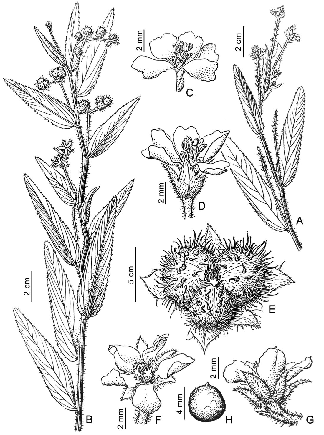 A. Porción de rama florífera. B. Porción de rama fructífera. C. Corola y androceo. D. Flor estaminada. E. Cápsula. F-G. Flor pistilada. H. Semilla. Tomado de Folia Bot. Geobot. Corrent. 3: fig. 2. 1989.