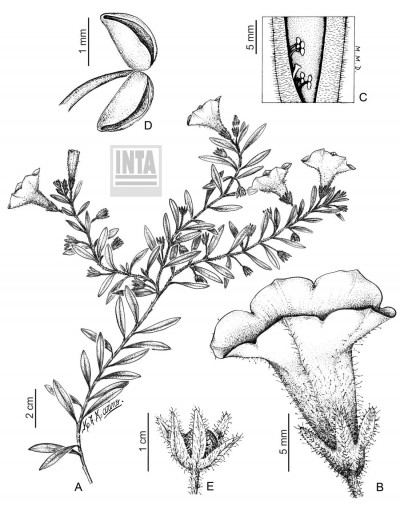Hierbas anuales o perenes hasta de 40 cm de alto, erectas al inicio de su desarrollo, luego ramificadas desde la base con tallos decumbentes y ascendentes; tallos cilíndricos, glandulosopilosos, bastante variables en longitud, ramificados tricotómicamente a partir de la inflorescencia. Hojas basales largamente atenuadas en falso pecíolo, las apicales sésiles; láminas elípticas u oblongas, de 25-45 × 8-20 mm, base cuneada o largamente atenuada, el ápice agudo, más raro obtuso, membranáceas, con nervadura primaria marcada y secundarias poco evidentes, esparcidamente glanduloso-pilosas, excepto en los nervios y en el margen. Flores asociadas a un par de hojas opuestas; pedicelos de 8-11,5 mm, deflexos, glanduloso-pilosos; cáliz verde, tubo de 2-3 mm, lóbulos lineares, de 3-7 × 1 mm, ápice obtuso, glanduloso-pilosos; corola infundibuliforme, ligeramente zigomorfa, de 18-28 cm, purpúrea, garganta pupúreoclara o blanquecina hacia el interior del tubo, limbo de 17-23 mm de diámetro, lóbulos casi enteros, obtusos o retusos, ápice truncado o cuspidado; filamentos adnatos 2,8-4,5 mm a la base de la corola, el menor libre de 4,5-6 mm, el par mediano de 5,6-7 mm y el par mayor de 9-12 mm, anteras de 1,5-2 mm, abiertas parcialmente, acanaladas, alineadas longitudinalmente al eje de la flor, polen violáceo; ovario de 1,5-3 mm, cónico, estilo de 8-11 mm, estigma dilatado, obcónico. Cápsula ovoide, de 5-7 mm, castaña; cáliz fructífero 1½-2 veces mayor que la cápsula, con lóbulos fuertemente recurvos; pedicelo fructífero de 8-37 mm, deflexo; semillas globosas a subreniformes, de 0,5-0,6 mm.
