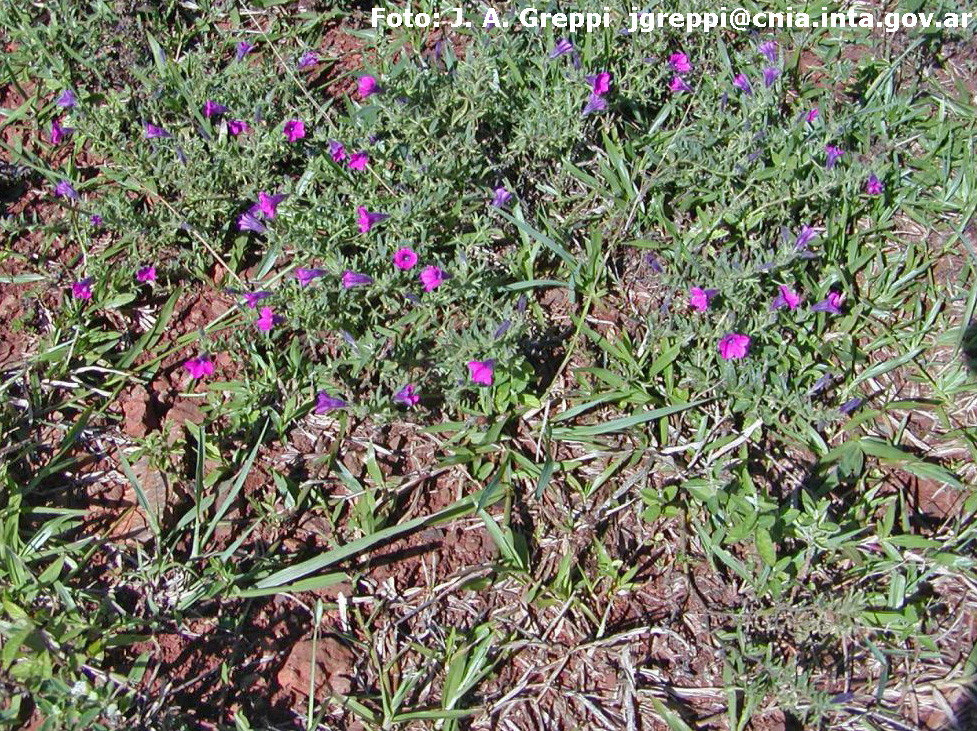Hierbas anuales o perenes hasta de 40 cm de alto, erectas al inicio de su desarrollo, luego ramificadas desde la base con tallos decumbentes y ascendentes; tallos cilíndricos, glandulosopilosos, bastante variables en longitud, ramificados tricotómicamente a partir de la inflorescencia. Hojas basales largamente atenuadas en falso pecíolo, las apicales sésiles; láminas elípticas u oblongas, de 25-45 × 8-20 mm, base cuneada o largamente atenuada, el ápice agudo, más raro obtuso, membranáceas, con nervadura primaria marcada y secundarias poco evidentes, esparcidamente glanduloso-pilosas, excepto en los nervios y en el margen. Flores asociadas a un par de hojas opuestas; pedicelos de 8-11,5 mm, deflexos, glanduloso-pilosos; cáliz verde, tubo de 2-3 mm, lóbulos lineares, de 3-7 × 1 mm, ápice obtuso, glanduloso-pilosos; corola infundibuliforme, ligeramente zigomorfa, de 18-28 cm, purpúrea, garganta pupúreoclara o blanquecina hacia el interior del tubo, limbo de 17-23 mm de diámetro, lóbulos casi enteros, obtusos o retusos, ápice truncado o cuspidado; filamentos adnatos 2,8-4,5 mm a la base de la corola, el menor libre de 4,5-6 mm, el par mediano de 5,6-7 mm y el par mayor de 9-12 mm, anteras de 1,5-2 mm, abiertas parcialmente, acanaladas, alineadas longitudinalmente al eje de la flor, polen violáceo; ovario de 1,5-3 mm, cónico, estilo de 8-11 mm, estigma dilatado, obcónico. Cápsula ovoide, de 5-7 mm, castaña; cáliz fructífero 1½-2 veces mayor que la cápsula, con lóbulos fuertemente recurvos; pedicelo fructífero de 8-37 mm, deflexo; semillas globosas a subreniformes, de 0,5-0,6 mm.