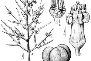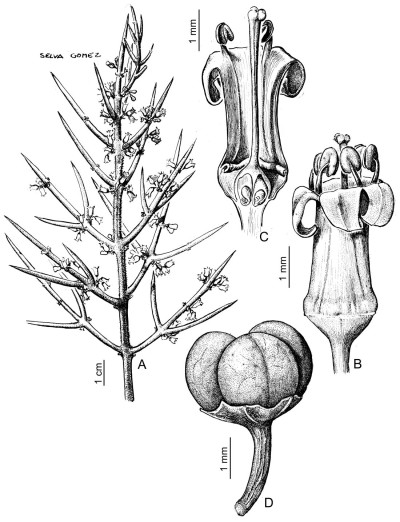Observaciones: Nombre vernáculo. “Espino negro”. Especie polimorfa en cuanto al hábito y tamaños de espinas y de ramas espiniformes.