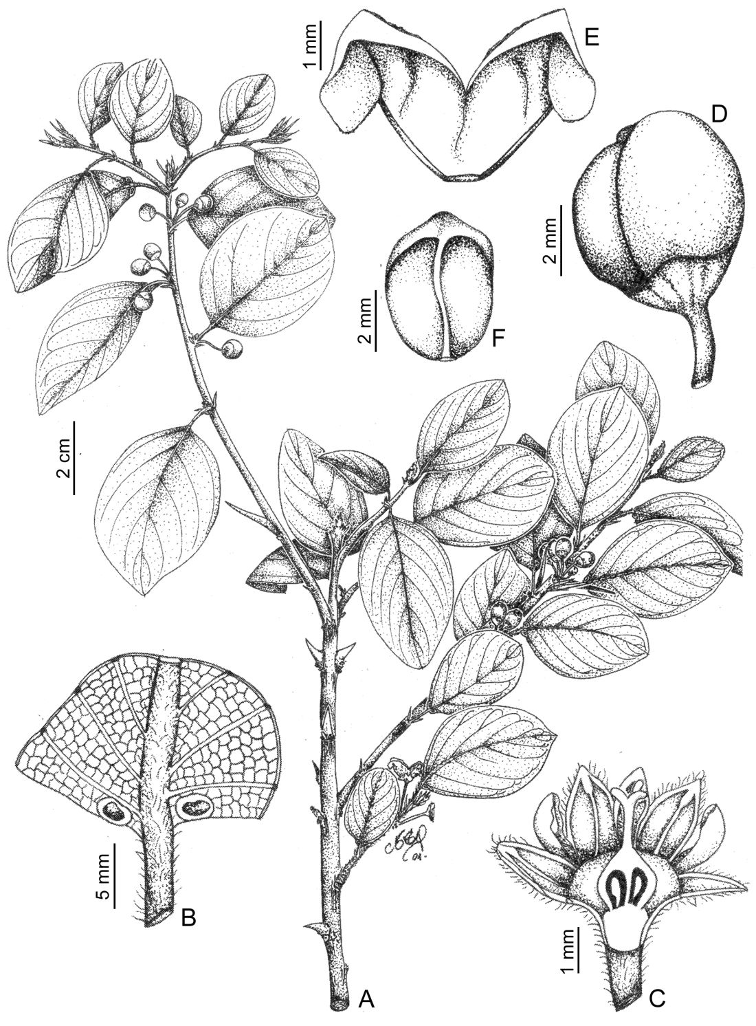 A. Rama fructífera. B. Detalle de glándulas foliares. C. Flor. D. Fruto. E. Carpidio. F. Semilla. [Extraído de Fl. Paraguay 44: 12, fi g. 2. 2013].