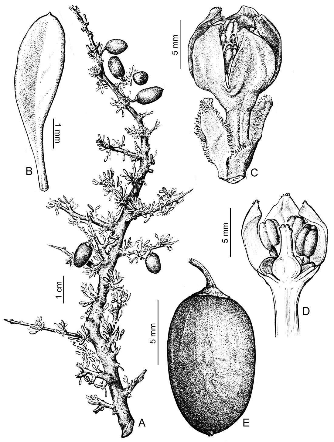 A. Rama fructífera. B. Hoja. C. Flor. D. Flor, corte longitudinal. E. Fruto.