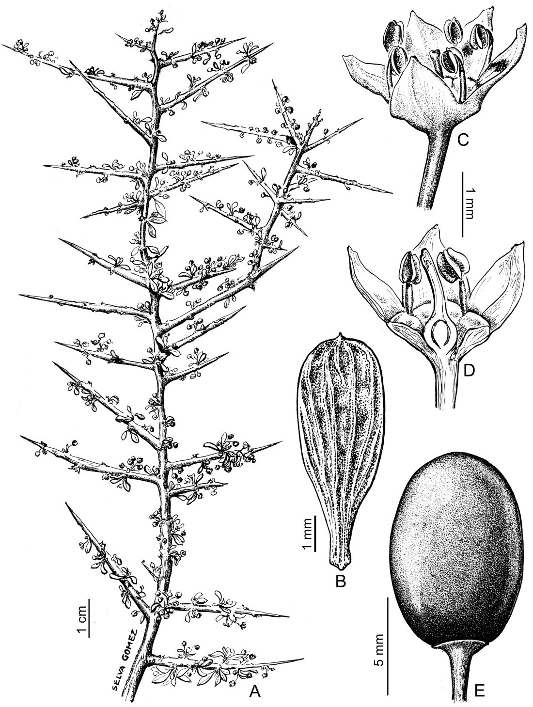 Arbustos de 0,5-2(-2,5) m de alto; tronco con corteza delgada, escamosa, gris o castaña; ramas primarias de 15-30 cm de largo, arqueadas y algo flexuosas, las secundarias terminadas en espinas de 2-6(-10) cm de largo, con braquiblastos de 1-3 mm de largo, hispídulas o viscoso-estrigulosas o glabras; entrenudos de 1-3(-5) mm de largo. Hojas alternas o generalmente en fascículos de 2-5(-7) sobre braquiblastos ; pecíolos de menos de 1 mm de largo, hispídulos o glabros; láminas obovadas a elíptico-obovadas, de (0,3-)0,4-0,8(-1,7) × (0,1-)0,2-0,4(-0,7) cm, cuneadas, de ápice redondeado, retuso a mucronado, el margen entero, subcoriáceas o coriáceas, hispídulas, viscoso-estrigulosas a glabras; cara abaxial de las láminas con depresiones o criptas estomatóforas profundas; estípulas lanceoladas, de (0,6-)1,2-1,5 mm de largo, subcartáceas, estrigosas o microvelutinosas. Flores en fascículos de (1-)2-5 en braquiblastos; pedicelos de (2,5-)5-6(-8) mm de largo, casi rectos, hispídulos a viscoso estrigosos a glabros; sépalos deltoides, de (1,2-)1,5-1,7(-1,9) mm de largo, oliva pálidos o amarillo-verdosos, exteriormente hispídulos a viscosos, estrigosos a glabros, a menudo reflexos en la antesis, caducos; pétalos ausentes; estambres alternisépalos, de 1-1,3 mm de largo; anteras de 0,4-0,9 mm de largo; ovario globoso-cónico, purpúreo-oscuro, glabro; estilo ca. 0,9-1,2 mm de largo, purpúreo-oscuro. Fruto una drupa ovoide, de 7-9 × 4-5(-6) mm, apiculada, amarilla, roja o negra. Semillas 1-2.