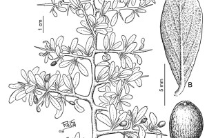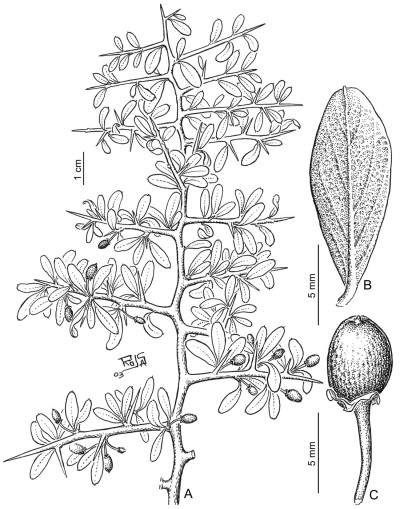 Árboles de 1,4-3,5 m de alto; troncos con corteza vieja áspera, longitudinal y transversalmente estriada, fuscosa; corteza más joven de color blanco grisáceo; espinas secundarias de 8-10 cm de largo, y a veces con espinas terciarias. Hojas en fascículos de 3-5 sobre braquiblastos; pecíolos ca. 2 mm de largo; láminas oblongas, espatuladas u oboval-espatuladas, ca. 0,8-1,8 × 0,6-0,7 cm, obtusas a mucronadas, el margen entero; cara abaxial con depresiones o criptas estomatóforas poco profundas; estípulas escariosas, pilosas. Flores en fascículos de 4 sobre braquiblastos; pedicelos de 4-5(-6) mm de largo, ligeramente pilosos, amarillentos; sépalos triangulares, ca. 3 × 2 mm, mucronulados; estambres de 2 mm de largo; ovario ligeramente cónico, ca. 0,5 mm de largo, estigma cónico 3-fido. Fruto una drupa solitaria o en pares sobre braquiblastos, cuando inmadura alargada y verde, cuando madura globosa, ca. 8,5 mm de largo, negra-rojiza a negra.