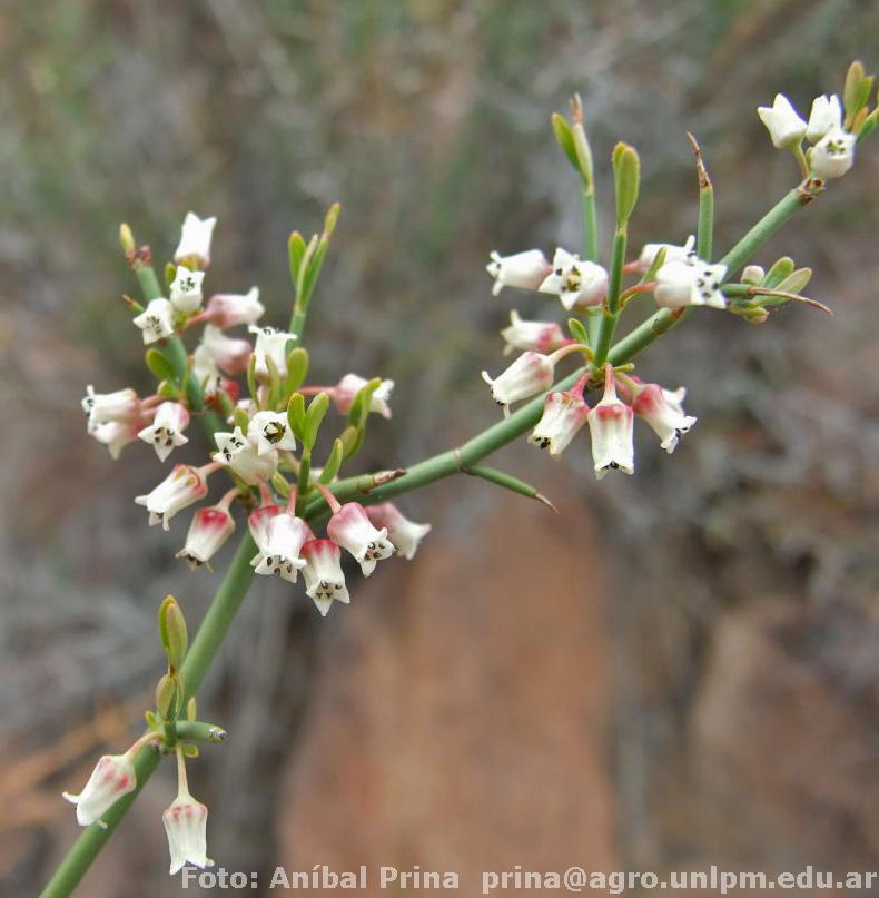Arbustos de 0,15-2,5 m de alto, subáfilos, generalmente glabros; tallos leñosos retorcidos, de corteza surcada, de los que nacen ramas erectas con espinas decusadas en casi todos los nudos; espina 1(-2)-nodal, muchas veces ramificada, de 1-3 cm de largo. Hojas con pecíolo de 0,5-1,5 mm de largo; láminas linear-elípticas, de 0,4-1 cm de largo, el margen entero o dentado, retinervadas, pubescentes; estípulas ca. 1,5 mm de largo. Flores 4-5-meras con pedicelo de 1-8 mm de largo, solitarias o en cimas 2-3 floras, blancas o rosadas; tubo urceolado, de 3-5 mm de largo, relación longitud-diámetro de 1,1-2; dientes del cáliz de 1-1,5 mm de largo, erectos o reflexos; pétalos linear-elípticos, ligeramente cuculados, de 0,6-1,2 mm de largo, a veces reducidos o uno o más ausentes, de ápice agudo a apiculado; estambres con filamentos de 0,7-1 mm de largo, anteras de igual longitud; ovario glabro, estilo de 2-3 mm de largo. Fruto ca. 5 mm de diámetro. Semillas de 3,5-4 mm de largo.