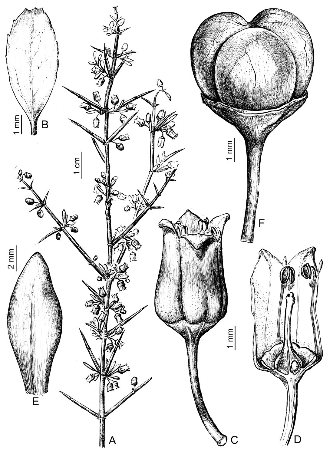 Arbustos de 0,15-2,5 m de alto, subáfilos, generalmente glabros; tallos leñosos retorcidos, de corteza surcada, de los que nacen ramas erectas con espinas decusadas en casi todos los nudos; espina 1(-2)-nodal, muchas veces ramificada, de 1-3 cm de largo. Hojas con pecíolo de 0,5-1,5 mm de largo; láminas linear-elípticas, de 0,4-1 cm de largo, el margen entero o dentado, retinervadas, pubescentes; estípulas ca. 1,5 mm de largo. Flores 4-5-meras con pedicelo de 1-8 mm de largo, solitarias o en cimas 2-3 floras, blancas o rosadas; tubo urceolado, de 3-5 mm de largo, relación longitud-diámetro de 1,1-2; dientes del cáliz de 1-1,5 mm de largo, erectos o reflexos; pétalos linear-elípticos, ligeramente cuculados, de 0,6-1,2 mm de largo, a veces reducidos o uno o más ausentes, de ápice agudo a apiculado; estambres con filamentos de 0,7-1 mm de largo, anteras de igual longitud; ovario glabro, estilo de 2-3 mm de largo. Fruto ca. 5 mm de diámetro. Semillas de 3,5-4 mm de largo.