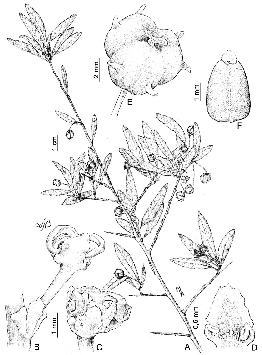 A. Rama fructífera. B. Bráctea con glándulas basales estipitadas y flor pistilada. C. Flor pistilada en fructificación. D. Sépalo de flor pistilada con glándulas basales, cara interna. E. Fruto. F. Semilla, vista hilar.