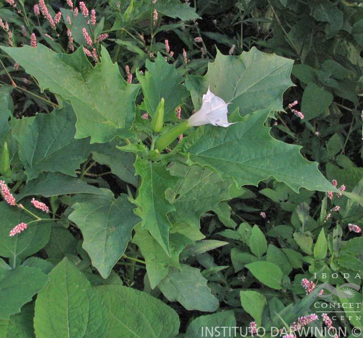 Hierbas anuales, hasta de 0,80(-1) m de alto, glabrescentes a glabras, con tricomas eglandulares, adpresos y antrorsos; tallos jóvenes con algunos tricomas glandulares. Pecíolos de 1,5-6(-8) cm, pubescentes superiormente y con algunos tricomas glandulares cuando jóvenes; láminas ovadas, anchamente ovadas a subdeltoides, de 8-12(-18) × 15-12 cm, base truncada o cuneada desigual, ápice agudo, cuando jóvenes a veces enteras, las adultas sinuadas a irregularmente poco lobadas o dentadas, glabrescentes en ambas caras excepto sobre los nervios principales donde son pubescentes. Flores en las bifurcaciones de los tallos o axilares; pedicelos erectos de 10-15 mm, pubescentes; cáliz tubuloso-anguloso, de 2-4 cm, glabro por dentro y pubescente por fuera con largos tricomas antrorsos y pequeños glandulares, tubo de 2,5-3,5 cm, lóbulos triangular-agudos, de 5 × 1,7-2 mm; corola blanca, de 4-6 cm, con diminutos tricomas glandulares externamente, limbo con 5 lóbulos pequeños y subulados; estambres adheridos a la misma altura en la mitad inferior del tubo corolino, filamentos subiguales, ca. 13,5 mm, anteras de 3- 4,5 mm; ovario ovoide a cónico, pubescente, cubierto de prolonprolongaciones carnosas gruesas, estilo de 20-25 mm, estigma de 2,8 × 2,5 mm. Cápsula ovoide, erecta, íntegramente pubescente, de 3- 5 cm, cubierta con menos de 30 espinas cortas, cónicas, gruesas, estriadas, erectas o recurvadas, hasta de 18(-20) × 2-4(-5) mm de ancho en la base, las inferiores más cortas; semillas reniformes, negras, de 4-4,5(-5) × 3-3,3 mm, episperma reticulado.