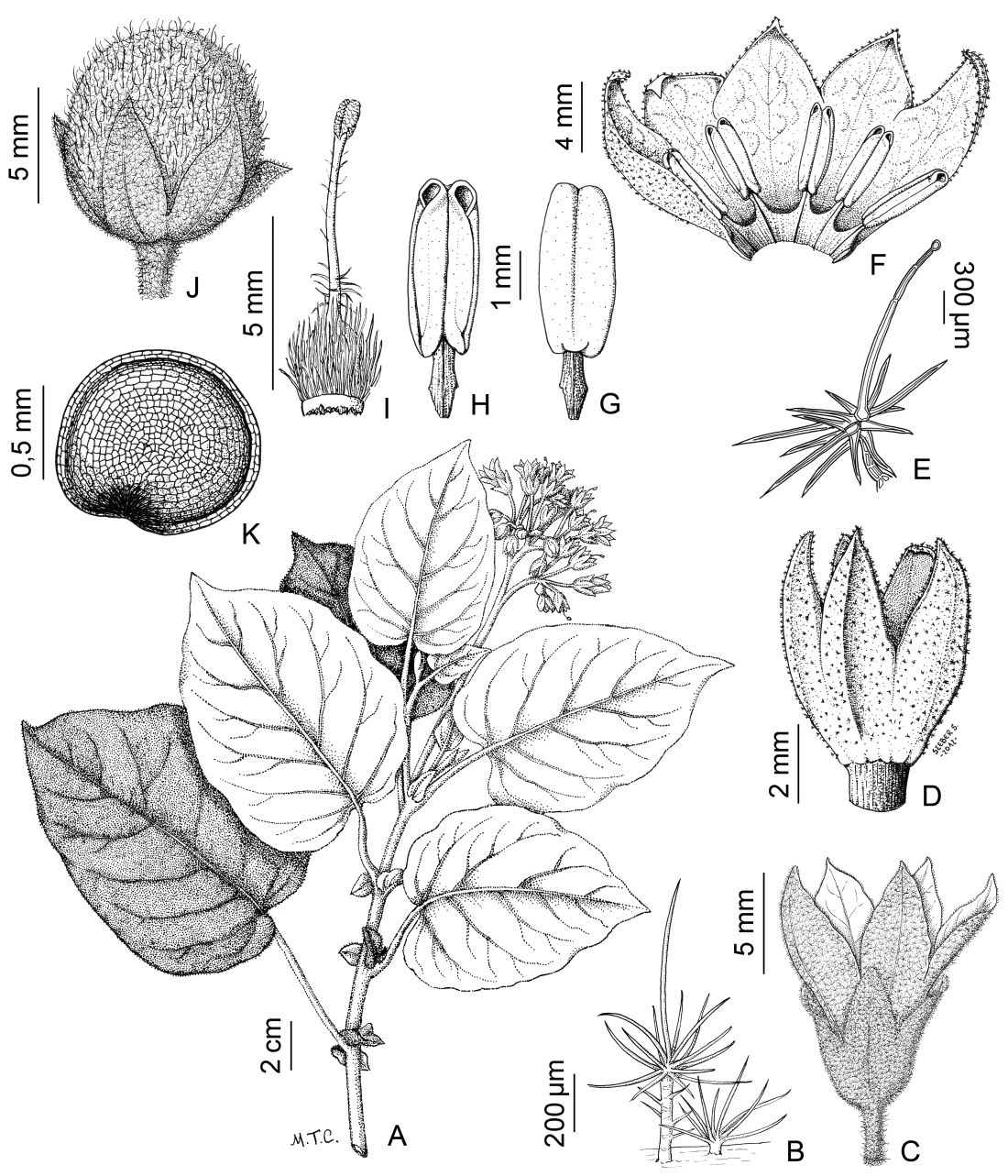 A. Rama florífera. B. Indumento del tallo. C. Flor luego de la antesis. D. Cáliz. E. Tricoma estrellado estipitado del cáliz. F. Corola desplegada. G. Estambre, vista dorsal. H. Estambre, vista ventral. I. Gineceo. J. Fruto. K. Semilla.