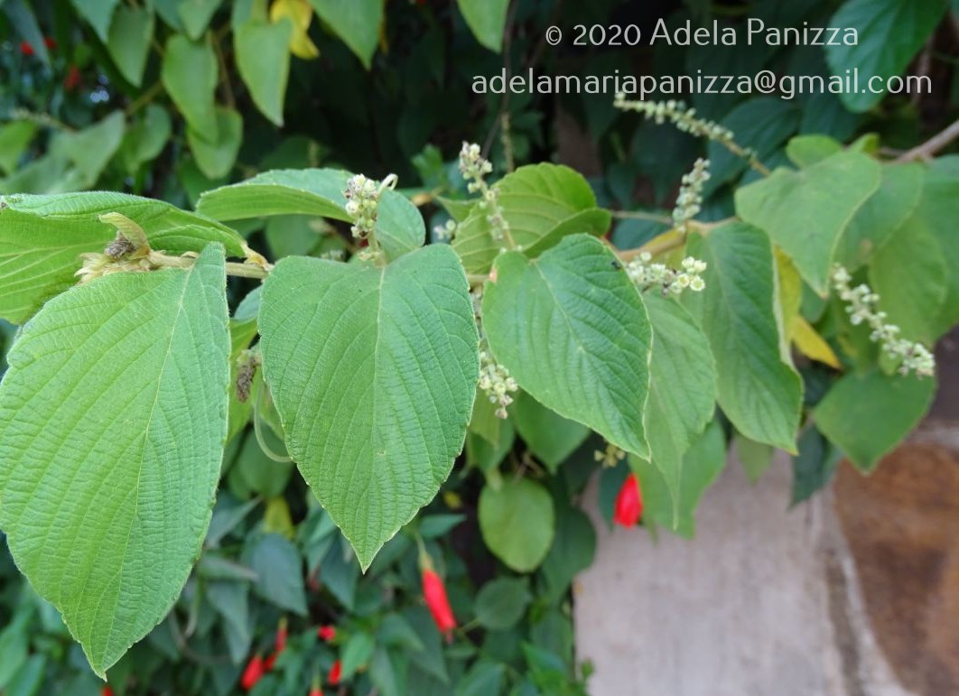 Lianas de 3-5(-6) m de alto; tallos jóvenes y hojas con pubescencia broncínea. Hojas con pecíolo de 1-2,3 cm de largo, pubescente; lámina de 1,3-5,5 × 3-8,5 cm, cara adaxial más o menos pubescente, cara abaxial tomentosa, el margen crenado. Inflorescencias en panículas de 7,5-28 cm de largo; brácteas triangulares ca. 0,5 mm de largo, pubescentes. Flores de 2,5-3,5 mm de diámetro, blancas; tubo de 1 mm de largo; dientes del cáliz de 2 mm de largo; pétalos de 1,5-2 mm de largo; estambres de 1 mm de largo; disco nectarífero de 2 mm de diámetro, con lóbulos 2-lobados de 0,5 mm de largo, pubescente; estilo de 0,6-0,8 mm de largo. Frutos de 8 × 5 mm, densamente pubescentes, alas reniformes de 3 mm de ancho. Semillas de 3 × 2 mm, pardo-oscuras, brillantes.