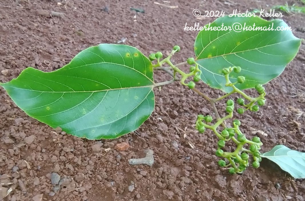 Árboles de 3-15 m de alto, con corteza lisa; ramas pardo-grisáceas, con estrías y numerosas lenticelas claras. Hojas con pecíolo de 1,5-3 cm de largo; lámina elíptica, de 8-15 × 5-10 cm, base redondeada o cordada, generalmente algo asimétrica, ápice acuminado, glabra en ambas caras o algo pubescente sobre los nervios de la cara abaxial; estípulas de 1,5 mm de largo, pubescentes. Inflorescencias en tirsos compuestos de varias cimas, con ca. 10 flores cada una; pedúnculos hasta de 3,5 cm de largo. Flores blanco-verdosas; tubo de 1 mm de largo; dientes del cáliz ca. 1 mm de largo; pétalos ca. 1 mm de largo, reflexos; estambres de 3 mm de largo, fi lamentos de 2 mm de largo, glabros y con la base ensanchada. Frutos de 6-7 mm de diámetro, glabros, blanco-grisáceos; pedúnculos carnosos, amarillo-anaranjados hasta rojizos. Semillas de 4 × 3 mm, pardo-oscuras.