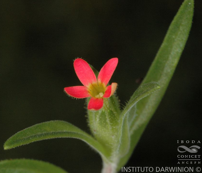 Hierba anual de 6-40 cm de alto, con los tallos erectos, simples o ramificados, pubescentes. Hojas elípticas, lineares a estrechamente oblongo-ovadas, de 10-60 × 2-12 mm, las caulinares alternas a subopuestas, a veces en roseta basal, simples, enteras, con el nervio central prominente en la cara abaxial, pubescentes generalmente en los márgenes y nervios, sésiles. Inflorescencias en cabezuelas, axilares o terminales, brácteas lanceoladas a ovadas con abundantes pelos glandulares en ambas superficies; Flores con cáliz ca. 10 mm de largo, lóbulos triangulares, agudos, de 5-6 mm de largo, con pubescencia glandulosa generalmente en los márgenes; corola ca. 22 mm de largo, hipocraterimorfa, lóbulos ovados, obtusos, de 5 × 2 mm, rojo carmesí en ambas caras, tubo corolino externa e internamente de anaranjado, polen blanco. Fruto una cápsula de contorno oblongo, de 4-6 mm de largo, mucronada, rodeada por el cáliz acrescente. Semillas de 3-4 mm de largo, pardo claras.