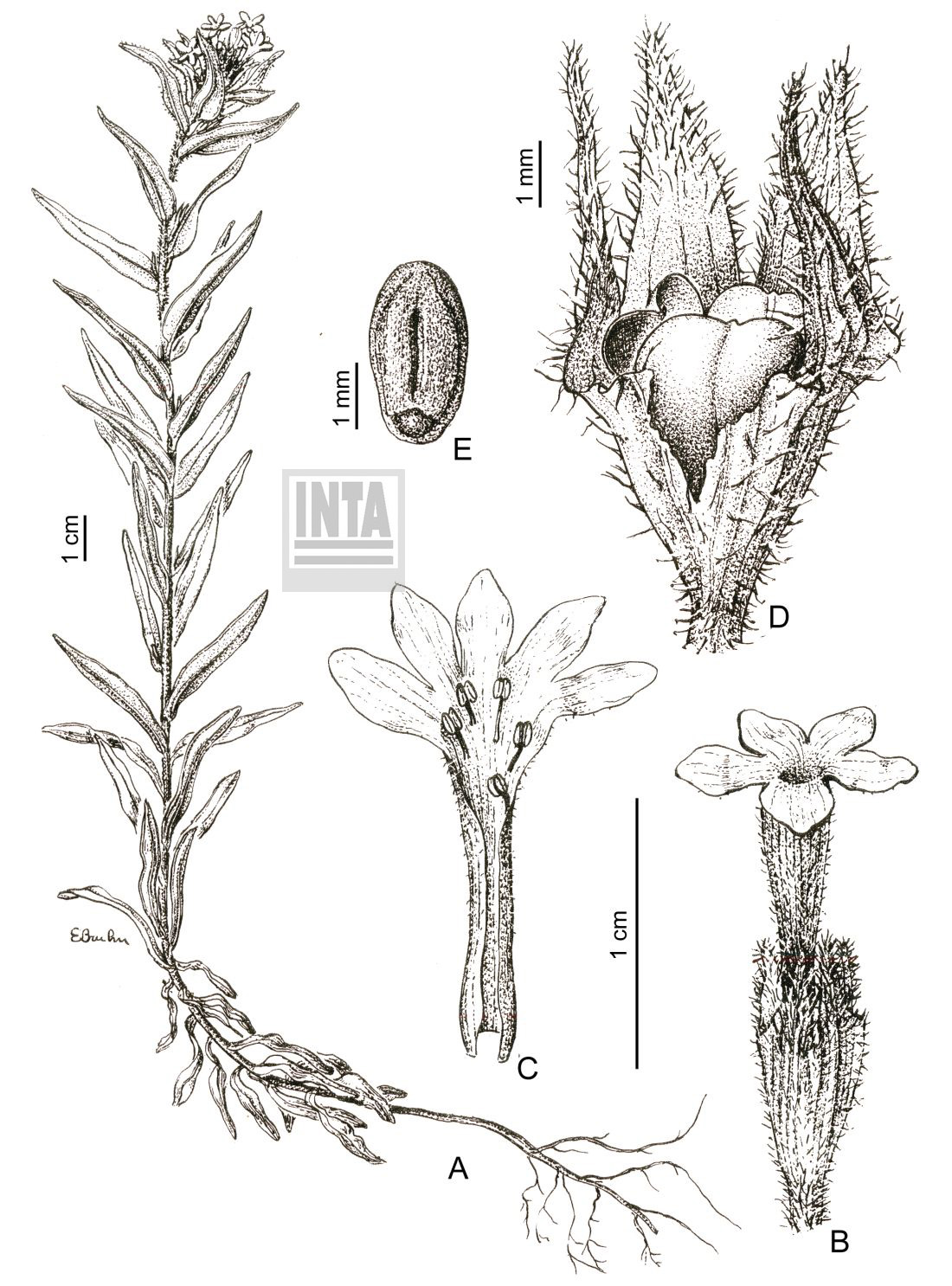 Hierba anual de 6-40 cm de alto, con los tallos erectos, simples o ramificados, pubescentes. Hojas elípticas, lineares a estrechamente oblongo-ovadas, de 10-60 × 2-12 mm, las caulinares alternas a subopuestas, a veces en roseta basal, simples, enteras, con el nervio central prominente en la cara abaxial, pubescentes generalmente en los márgenes y nervios, sésiles. Inflorescencias en cabezuelas, axilares o terminales, brácteas lanceoladas a ovadas con abundantes pelos glandulares en ambas superficies; Flores con cáliz ca. 10 mm de largo, lóbulos triangulares, agudos, de 5-6 mm de largo, con pubescencia glandulosa generalmente en los márgenes; corola ca. 22 mm de largo, hipocraterimorfa, lóbulos ovados, obtusos, de 5 × 2 mm, rojo carmesí en ambas caras, tubo corolino externa e internamente de anaranjado, polen blanco. Fruto una cápsula de contorno oblongo, de 4-6 mm de largo, mucronada, rodeada por el cáliz acrescente. Semillas de 3-4 mm de largo, pardo claras.
