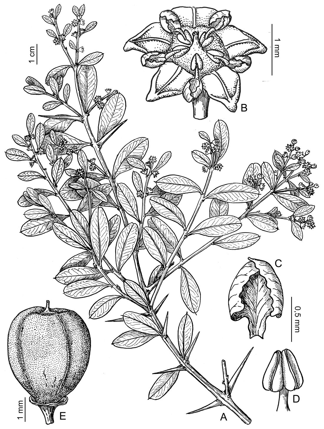 Arbustos o árboles de 2-10 m de alto; ramas glabras de 2 tipos: unas ortotrópicas, con hojas opuestas o subopuestas, decusadas, con espinas en su axila; las otras con crecimiento plagiotrópico, con hojas alternas, inermes. Hojas con pecíolo hasta de 1 mm de largo; láminas elípticas, de (1,5-)2-4(-5) × (0,8-)1-2,5(-3) cm, de base redondeada, ápice redondeado o atenuado, hasta emarginado, el margen entero, glabras verde-oscuras en la cara adaxial; nervio principal único, notorio. Inflorescencia con (1-)3-6(-10) flores; eje principal hasta de 3 mm de largo; pedicelos de 2-6 mm de largo; tubo obcónico, de 1 mm de largo, dientes del cáliz 5, de 1-1,5 mm de largo y ancho; pétalos 5, obcordados o 2-lobulados, de 0,5-0,8 mm de largo, reflexos; estambres inclusos en la concavidad de los pétalos cuando jóvenes, desenlazados y curvados hacia el pistilo en la antesis; disco nectarífero 5-gono, plano; ovario esférico de 0,8 mm de largo, 3-locular, estilo cilíndrico de 0,8-1 mm de largo, estigma capitado o levemente 2-lobado. Fruto una drupa de 6-7 × ca. 1,5 mm, negruzca. Semillas (1-)3(-4).
