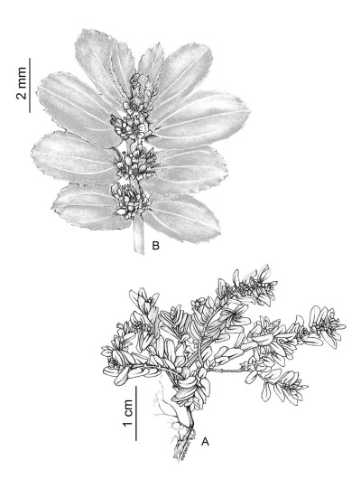 Hierbas anuales, ascendentes, hasta de 30 cm de alto con tricomas largos lanosos; tallos con ramificación alterna. Hojas opuestas, pecioladas; láminas elípticas, de 4-6 × 2-4 mm, los bordes dentados; estípulas parcialmente soldadas a ambos lados, membranáceas, laciniadas. Inflorescencias en 3-4 ciatios dispuestos en la axila de ramas con entrenudos muy próximos; involucro acopado-cilíndrico, de 1,5-1,7 × 0,5-0,7 mm; nectarios 4, ligeramente cóncavos con apéndices bien desarrollados, dos de ellos de mayor tamaño, lóbulos triangulares con numerosos tricomas en el borde. Flores estaminadas 5-10 por ciatio; bractéolas digitadas. Flores pistiladas aperiantadas; ovario con tricomas largos, estilos 2-fidos hasta el tercio apical. Fruto una cápsula subcónica, ca. 2 × 1,5-1,9 mm. Semillas ovoides, de 1-1,3 × 0,6-0,7 mm, lisas.