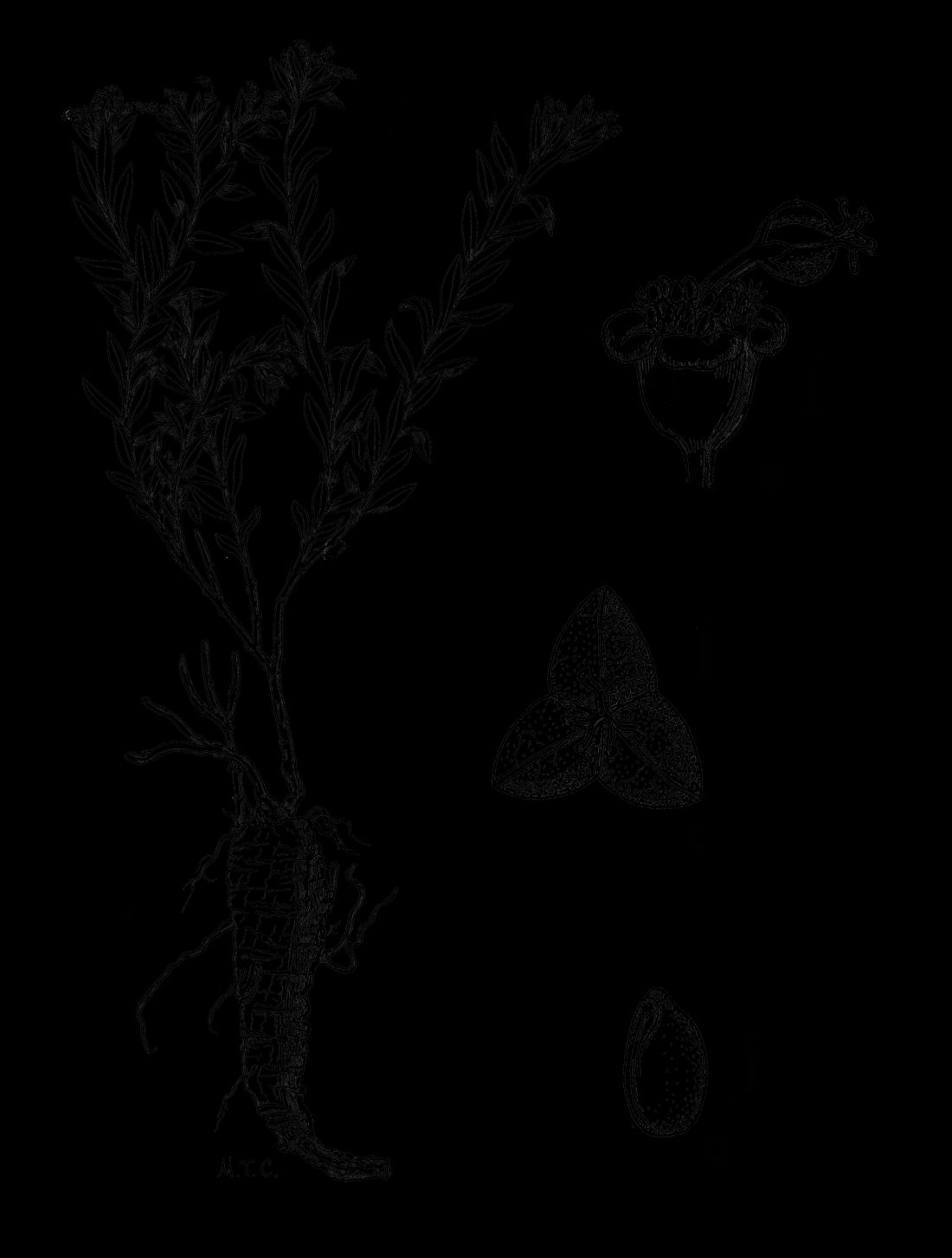A. Planta. B. Ciatio fructificado. C. Fruto, vista apical. D. Semilla, vista lateral.