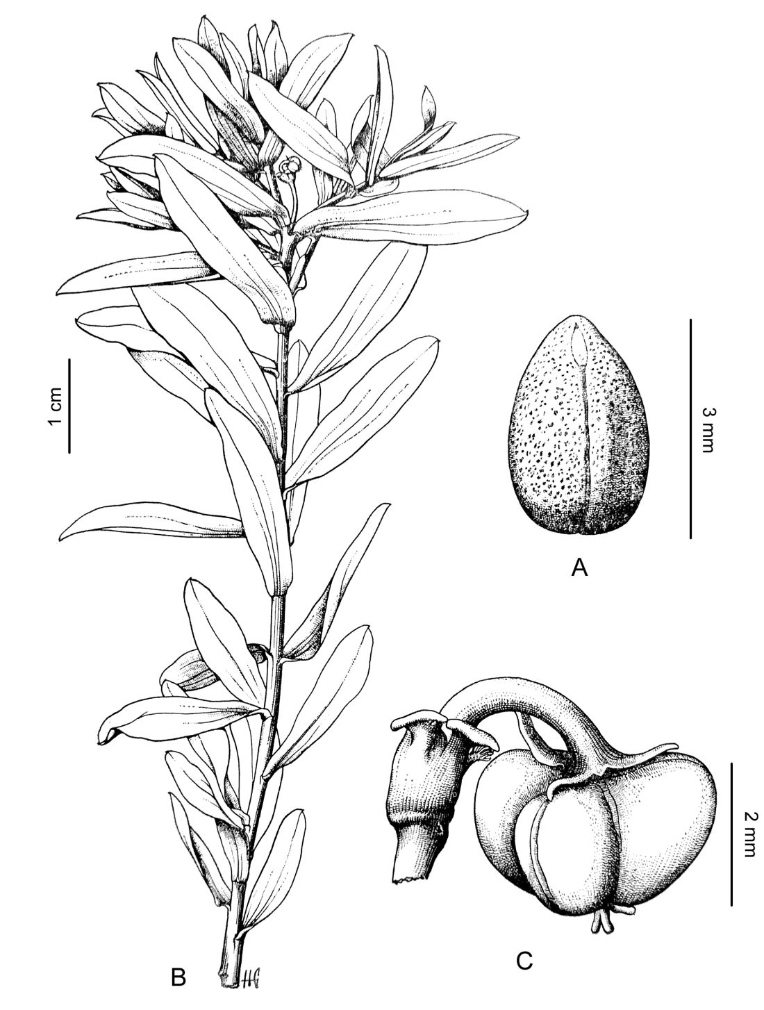 A. Semilla, vista hilar. B. Rama florífera. C. Ciatio fructificado.
