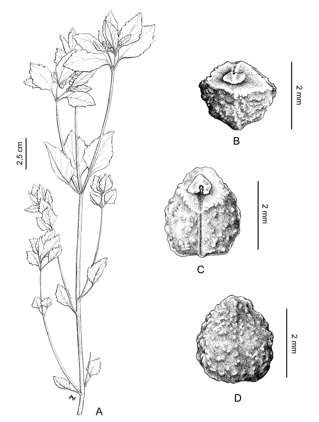 Hierbas anuales, de 4-20 cm de alto; tallos con entrenudos de 2-9 cm de largo. Hojas con pecíolos de 3-18(-25) mm de largo; láminas ovadas a rómbicas, de 10-60 × 10-30 mm, el margen dentado, indumento de tricomas verruculosos. Ciatios en dicasios simples; involucros cilíndricos, de 2-2,3 × 1-1,2 mm, con indumento escaso; involucro con 5 lóbulos rectangulares, levemente más altos que los nectarios, profundamente partidos, nectarios presentes o rudimentarios entre los lóbulos. Flores estaminadas 15-20; bractéolas 2-partidas, eglandulosas, provistas de tricomas. Flores pistiladas con breve rodete periántico, laxamente pilosas; estilos soldados en la base, 2-fidos hacia la porción distal. Fruto una cápsula globosa, de 3-3,6 × 4-4,5 mm, levemente deprimida. Semillas prismáticas, de 2-2,5 × 2,1-2,4 mm, tuberculadas; carúncula reniforme, ca. 1 mm de ancho.