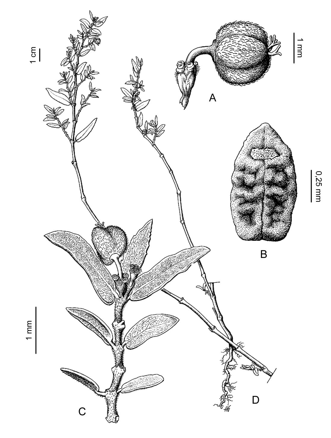 Hierbas perennes, ascendentes, hasta de 20 cm de alto, pilosas. Hojas opuestas; láminas ovado-lanceoladas a falcadas, de 12-20 × 6-9 mm, el margen parcialmente dentado; estípulas libres en la superficie ventral, soldadas en la superficie dorsal, con tricomas, membranáceas. Ciatios solitarios, axilares; involucro campanulado, de 1,5-2 × 1-1,5 mm, con indumento escaso (sólo en la región de los lóbulos) o nulo; nectarios 4, circulares, cóncavos, apéndices ausentes o muy reducidos, lóbulos triangulares con tricomas en el borde. Flores estaminadas 3-5; bractéolas triangulares, enteras, libres con tricomas pluricelulares. Flores pistiladas con un perianto discoidal (rodete); pedicelo glabro; ovario piloso; estilos soldados en la base, 2-fidos hacia distal. Fruto una cápsula ovoide, de 2-2,5 × 1,8-2 mm. Semillas ovoides, de 1-1,3 × 0,6-0,8 mm, rugosas.