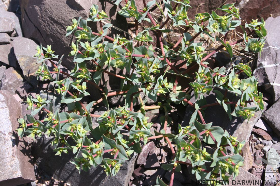 Plantas monoicas, perennes, de 10-20 cm de alto, glabérrimas; raíz gruesa, tuberosa; tallos numerosos, erectos, crasos. Hojas inferiores alternas, cortamente pecioladas; láminas orbiculares, de 10-15 × 15-25 mm, margen dentado o lacerado-dentado; las hojas superiores (brácteas florales) opuestas; láminas triangulares, de 20-30 × 15-20 mm, lacerado dentadas; estípulas ausentes. Ciatios en dicasios; involucro cupuliforme, ca. 2 × 2 mm; nectarios 5, ovado-trapezoidales, verdes, sin apéndices; lóbulos triangulares, 3-dentados, pilosos. Flores estaminadas 5-35; bractéolas 2-3-digitadas. Flores pistiladas con perianto 3-mero; estilos largos, 2-fidos. Fruto una cápsula globosa, de 3,5 × 3-3,5 mm, glabra. Semillas subprismáticas, de 3-3,2 × 2-2,5 mm, suavemente rugosas, oscuras, sin carúncula.