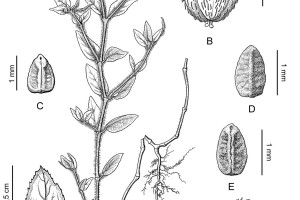 Hierbas anuales; ramas postradas a ascendentes, de 6-25 cm de alto, pubescentes, con indumento de tricomas blancos a amarillos. Hojas opuestas; pecíolos de 0,9-1,5 mm de largo; láminas ovadas u oblongas hasta subromboidales, de 4-13 × 3-7 mm, ápice agudo, base asimétrica, un lado anguloso y el otro redondeado, margen gruesamente serrulado, a menudo con una mancha purpúrea en el medio, el nervio central y las venas secundarias hundidas en la cara adaxial; estípulas subulado-filiformes, libres, pilosas. Inflorescencias en glomérulos densos de ciatios terminales, con hojas reducidas debajo de los ciatios; involucro obcónico, de 0,5-0,7 × 0,4-0,6 mm, estriguloso; nectarios 4, circulares a oblongos, cóncavos, con apéndices pequeños oblongos con el margen entero o bien ausentes. Flores estaminadas 2-8. Flores pistiladas aperiantadas; ovario estriguloso, estilos 2-fidos. Fruto una cápsula ovoide, de 1-1,2 × 1-1,3 mm. Semillas angostamente ovoides, 4-anguladas en sección transversal, de 0,7-0,9(-1,1) × ca. 0,5 mm, rugosas, con 3-6 costillas transversales suaves.