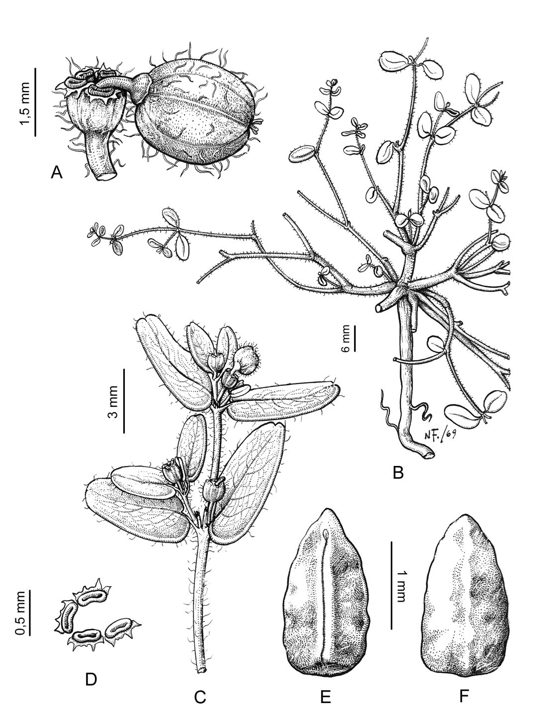 A. Ciatio. B. Planta. C. Rama florífera. D. Nectarios, vista apical. E-F. Semillas, vista hilar y dorsal respectivamente.