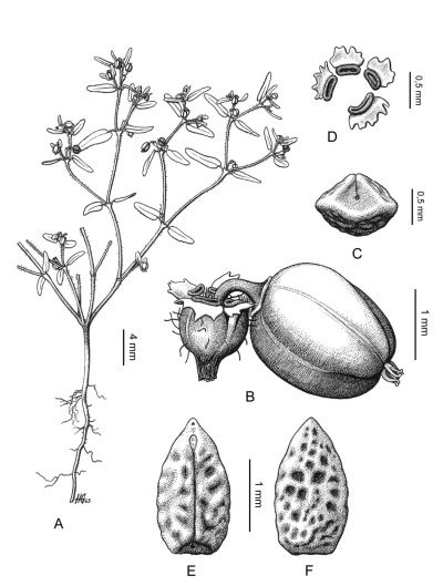 Hierbas anuales, decumbentes; tallos de 1,5-10 cm de largo, con ramificación dicotómica. Hojas opuestas; pecíolos de 0,8-1,2 mm de largo; láminas oblongo-elípticas, de 3-4 × 1,5-2 mm, base desigual, ápice obtuso, a veces oscuramente 3-5-denticuladas en el ápice; estípulas laciniadas, soldadas de un lado y libres del otro, las otras 2 libres. Ciatios solitarios terminales; pedúnculo más largo que la altura del involucro; involucro turbinado, de 1-1,2 × 0,8-1 mm, lóbulos triangulares laciniados, tan altos como los 4 nectarios; nectarios elípticos, cóncavos, con apéndices irregularmente lobulados. Flores estaminadas 6-9; bractéolas pequeñas 2-lobadas. Flores pistiladas aperiantadas; ovario glabro, estilos soldados en el tercio basal, ca. 0,5 mm de largo, erectos. Fruto una cápsula ovoide, de 2-2,5 × 1-1,7 mm. Semillas subovoides, de 1,2-2 × ca. 1,3 mm, foveoladas.