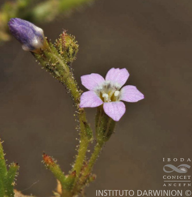 Hierba anual de 15-30 cm de alto, con tallos numerosos, erectos, con pubescencia lanosa o glabra en la porción inferior, glanduloso-pubérula hacia la porción superior. Hojas en roseta basal, pinnatilobadas a pinnatisectas, de 10-40(-50) mm de largo, carnosas, con los segmentos de 0,9-1,5(-2) mm de ancho, el ápice agudo y córneo, hojas caulinares 3-fidas o enteras, de 10-15 mm de largo, con pubescencia lanosa, glandulosas o no, carnosas, sésiles. Inflorescencias cimosas, con 2-3 flores, laxas, pedicelos de 1-8 mm de largo, glanduloso-pubescentes. Flores con cáliz urceolado, de 4-4,5 mm de largo, lacinias linear-lanceoladas, ca. 1,5 mm de largo con dientes agudos y reflexos, con pubescencia glandulosa o glabro; corola infundibuliforme, de 5-9 mm de largo, liliácea y con la garganta más pálida, lóbulos de la corola ovados, subagudos; estambres insertos en la base de los lóbulos corolinos, filamentos subulados, anteras ovoides de color celesteintenso, polen azul; ovario ovoide con ca. 15 óvulos. Fruto una cápsula oblongo-ovoide, de 5-7 mm de largo, mucronada, con el cáliz acrescente de igual o casi igual longitud que el fruto maduro. Semillas 4-11, elipsoideas, de 2-2,5 × 1 mm, amarillentas.
